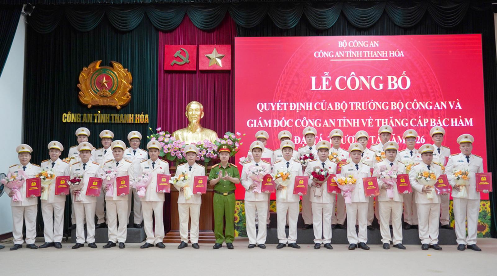 (Thanh tra) - Sáng 29/4, Công an tỉnh Thanh Hóa tổ chức lễ công bố 93 quyết định của Bộ trưởng Bộ Công an và Giám đốc Công an tỉnh về việc thăng cấp bậc hàm Đại tá, Thượng tá năm 2026 cho các trưởng phòng và tương đương, đội trưởng, trưởng công an một số xã, phường.