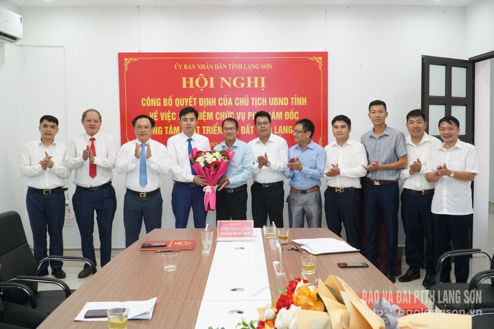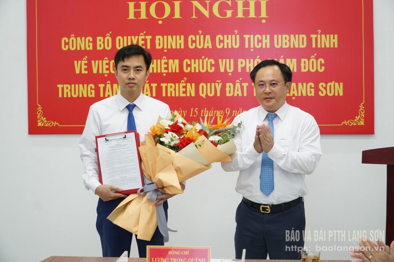 Đồng chí Phó Chủ tịch UBND tỉnh trao Quyết định bổ nhiệm và tặng hoa chúc mừng tân Phó Giám đốc Trung tâm Phát triển quỹ đất tỉnh. Ảnh: Baolangson.vn
