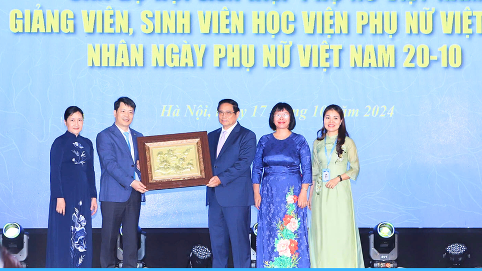 Thủ tướng Chính phủ tặng quà lưu niệm cho Học viện Phụ nữ Việt Nam. Ảnh: PN