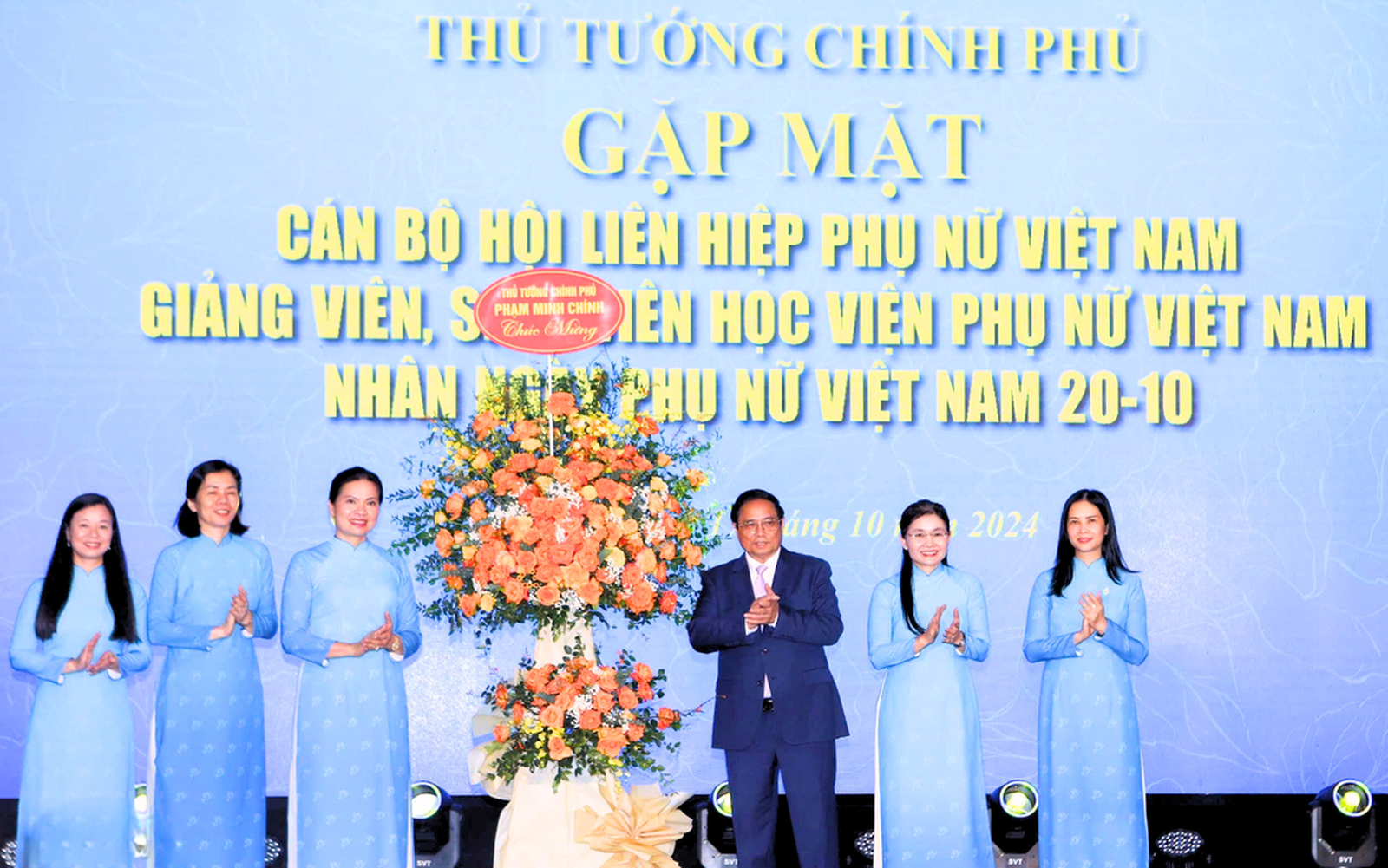 Thủ tướng Chính phủ Phạm Minh Chính tặng hoa chúc mừng Hội LHPN nhân dịp 20/10. Ảnh: PN