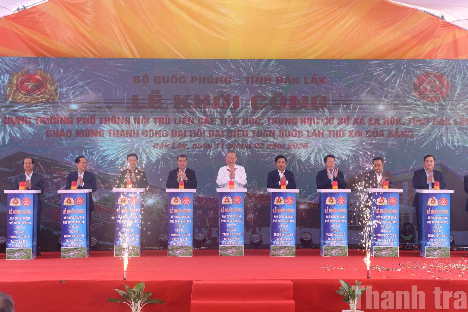 Tổng Bí thư Tô Lâm cùng các đại biểu thực hiện nghi thức khởi công xây dựng Trường phổ thông nội trú liên cấp Tiểu học và Trung học cơ sở xã Ea Rốk. Ảnh: NG