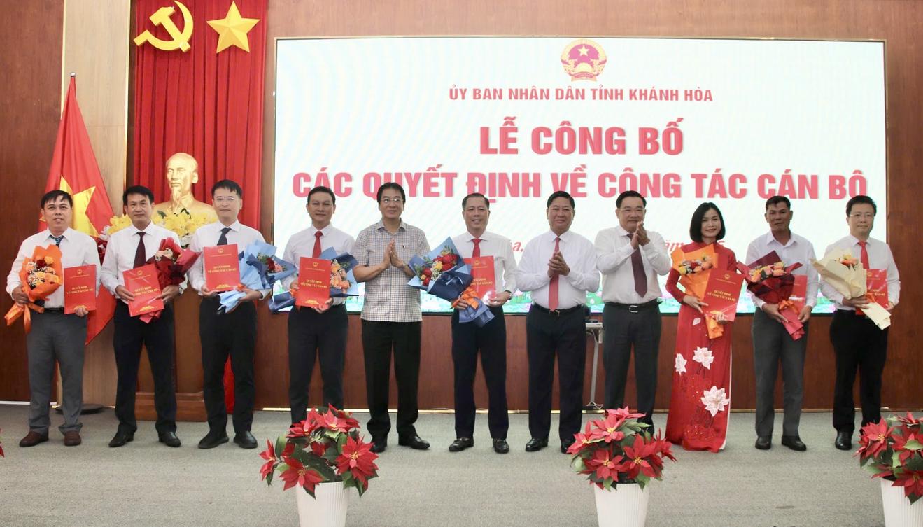 Lãnh đạo UBND tỉnh Khánh Hòa trao quyết định, hoa chúc mừng cho các cán bộ. Ảnh: CTV