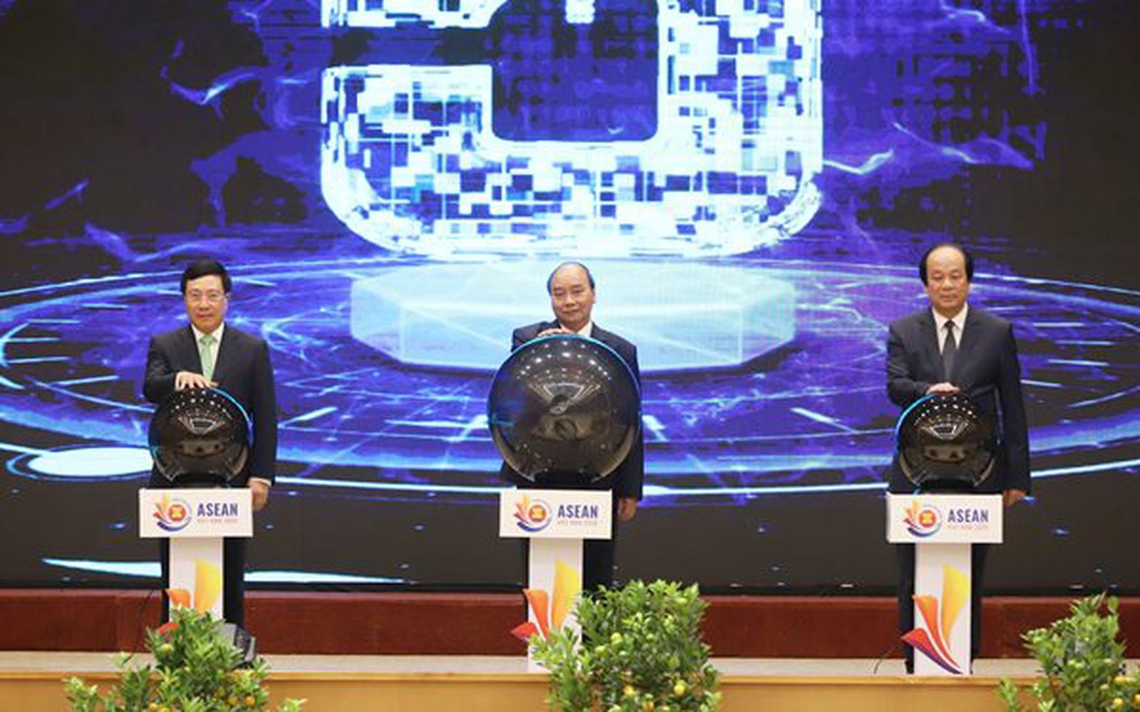 Thủ tướng Nguyễn Xuân Phúc cùng Phó Thủ tướng Phạm Bình Minh và lãnh đạo các bộ, ngành khai trương website ASEAN 2020. Ảnh: Quang Phúc