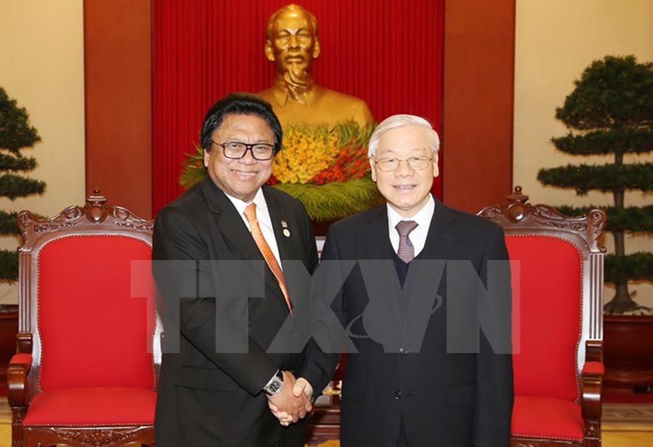 Tổng Bí thư Nguyễn Phú Trọng tiếp Chủ tịch Thượng viện Indonesia Oesman Sapta Odang. (Ảnh: Trí Dũng/TTXVN)