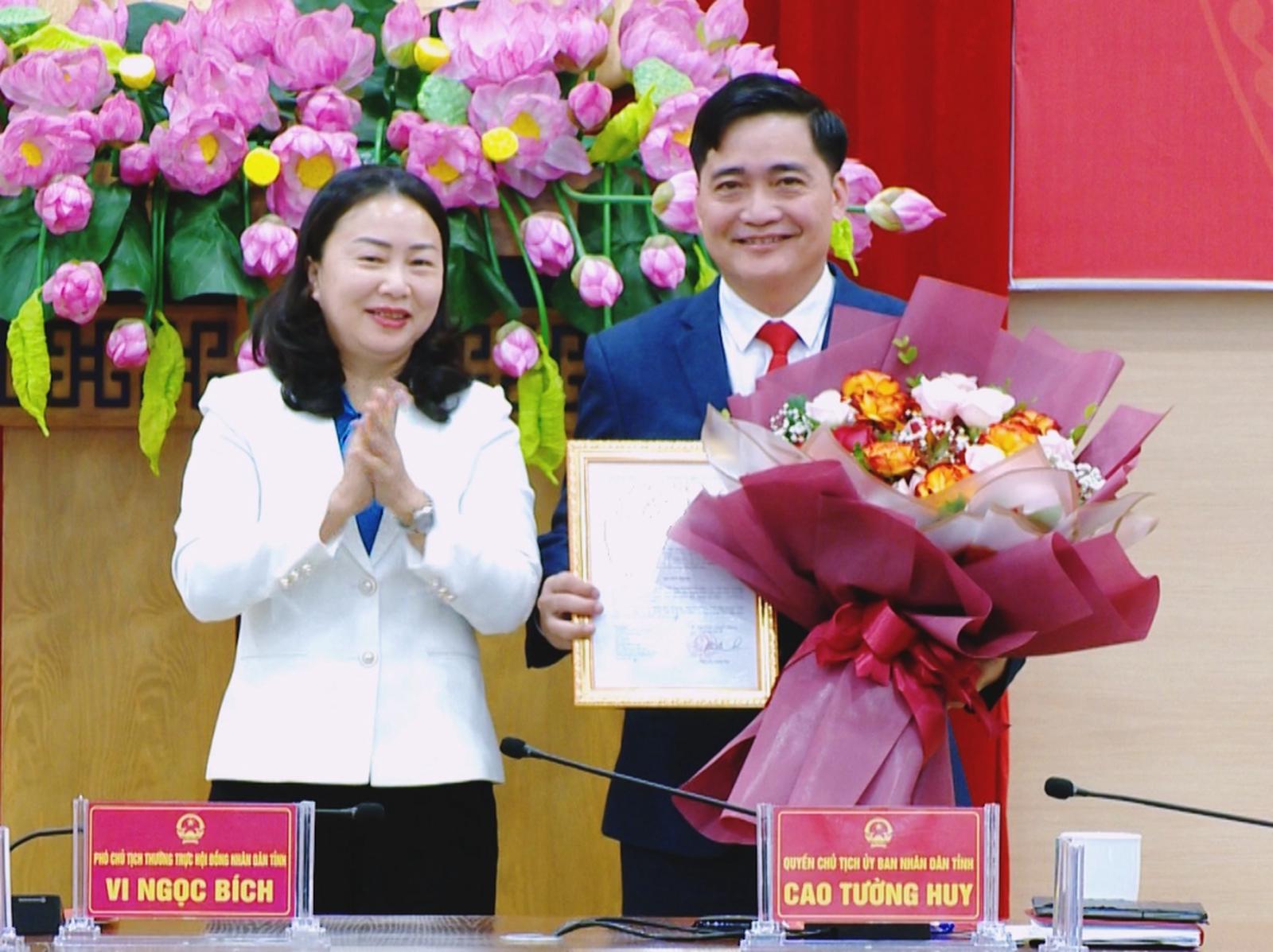 Quyền Chủ tịch UBND tỉnh Quảng Ninh Cao Tường Huy trao quyết định của UBND tỉnh về việc phê chuẩn kết quả bầu bổ sung ông Hoàng Văn Sinh, Phó Bí thư Huyện ủy Tiên Yên, giữ chức vụ Chủ tịch UBND huyện Tiên Yên, nhiệm kỳ 2021 - 2026.
