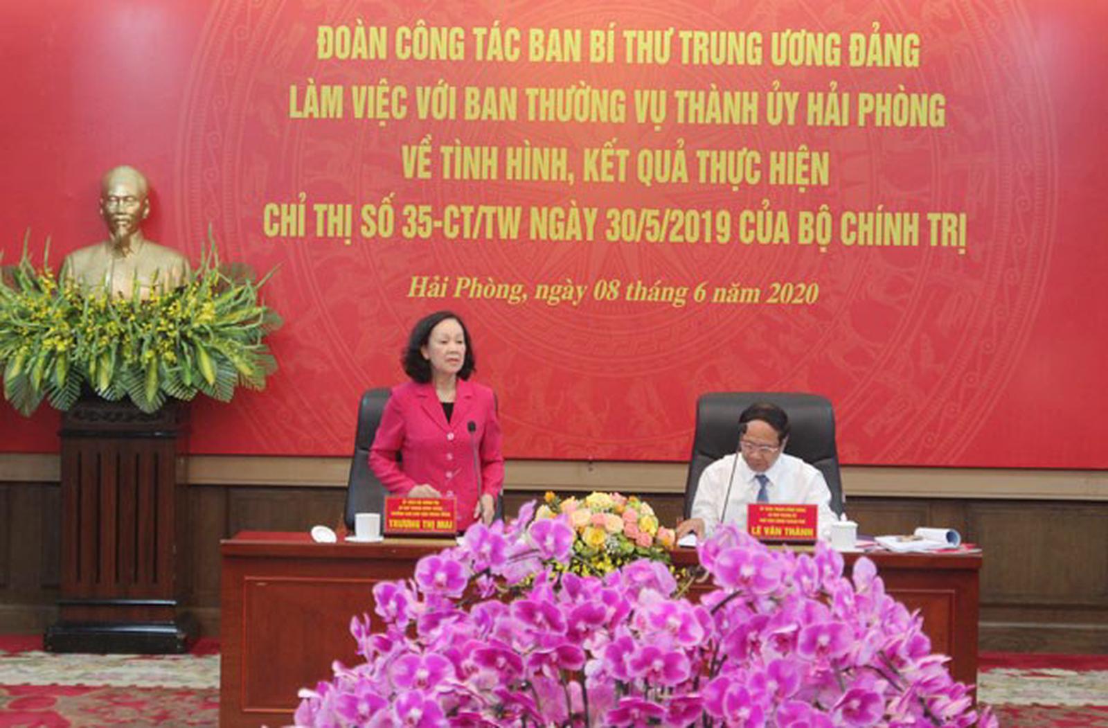 Phát biểu tại cuộc làm việc, Trưởng Ban Dân vận TƯ Trương Thị Mai đánh giá cao và tán thành báo cáo của Ban Thường vụ Thành ủy Hải Phòng về kết quả triển khai, tổ chức thực hiện Chỉ thị số 35 của Bộ Chính trị.