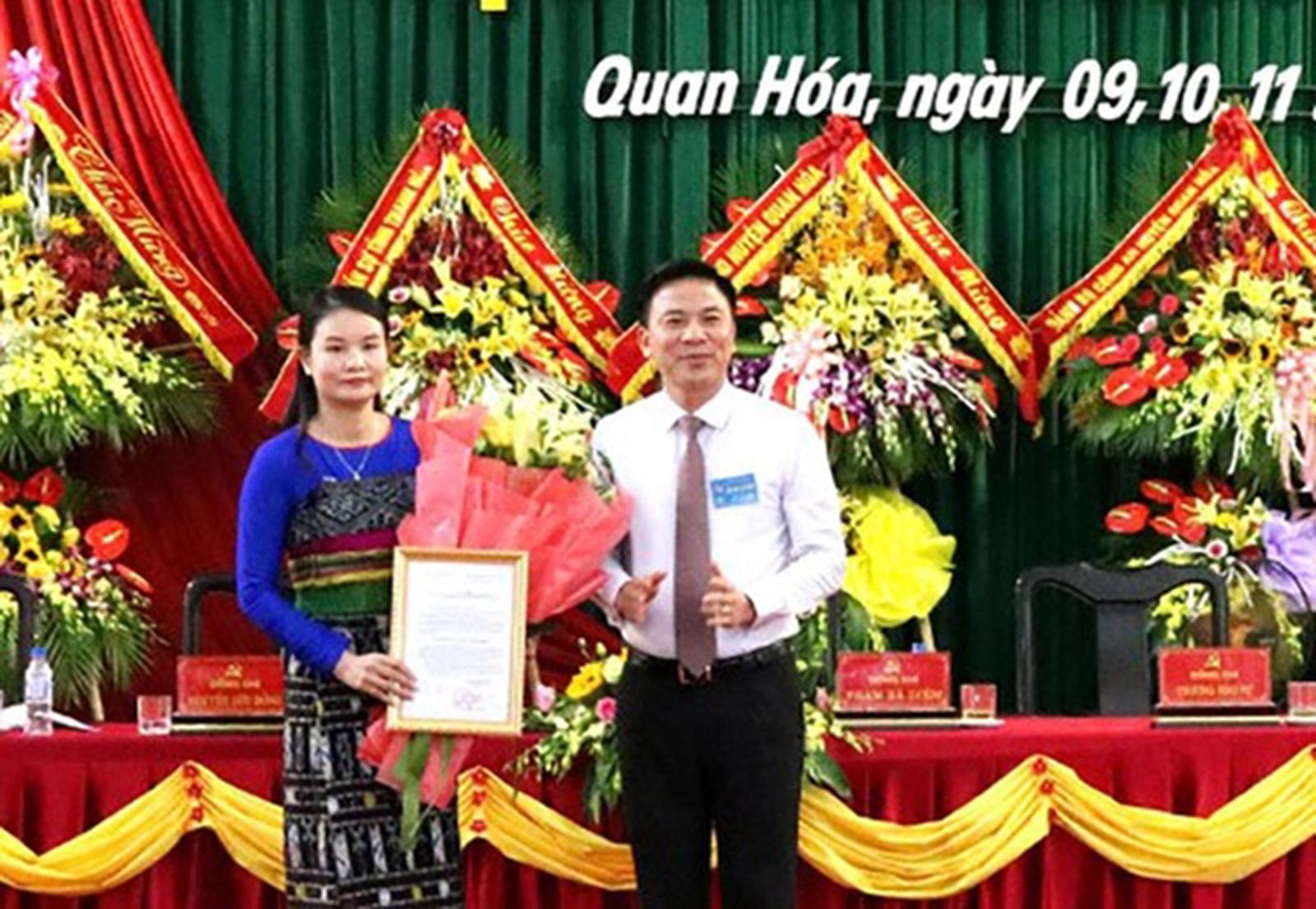 Ông Đỗ Trọng Hưng, Phó Bí thư Thường trực Tỉnh ủy Thanh Hóa (phải ảnh) trao Quyết định chỉ định Bí thư Huyện ủy huyện Quan Hóa cho bà Hà Thị Hương (trái ảnh). Ảnh: VT