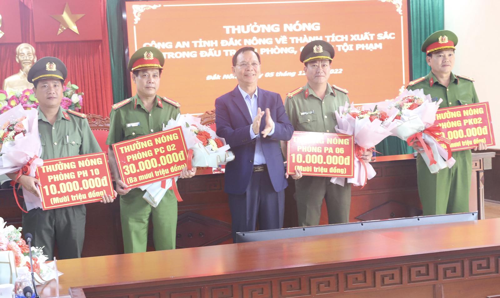 Đại tá Nguyễn Thanh Liêm, Giám đốc Công an tỉnh Đắk Nông trao thưởng cho các đơn vị về thành tích đấu tranh phòng, chống tội phạm. Ảnh: Công an cung cấp