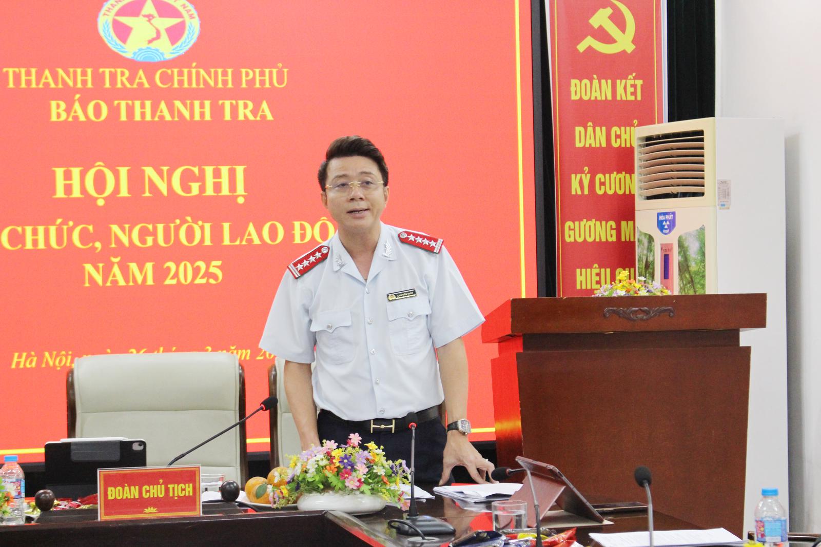 Phó Tổng biên tập Báo Thanh tra Chu Văn Thuỷ phát động phong trào thi đua tại Hội nghị viên chức, người lao động năm 2025. Ảnh: LP