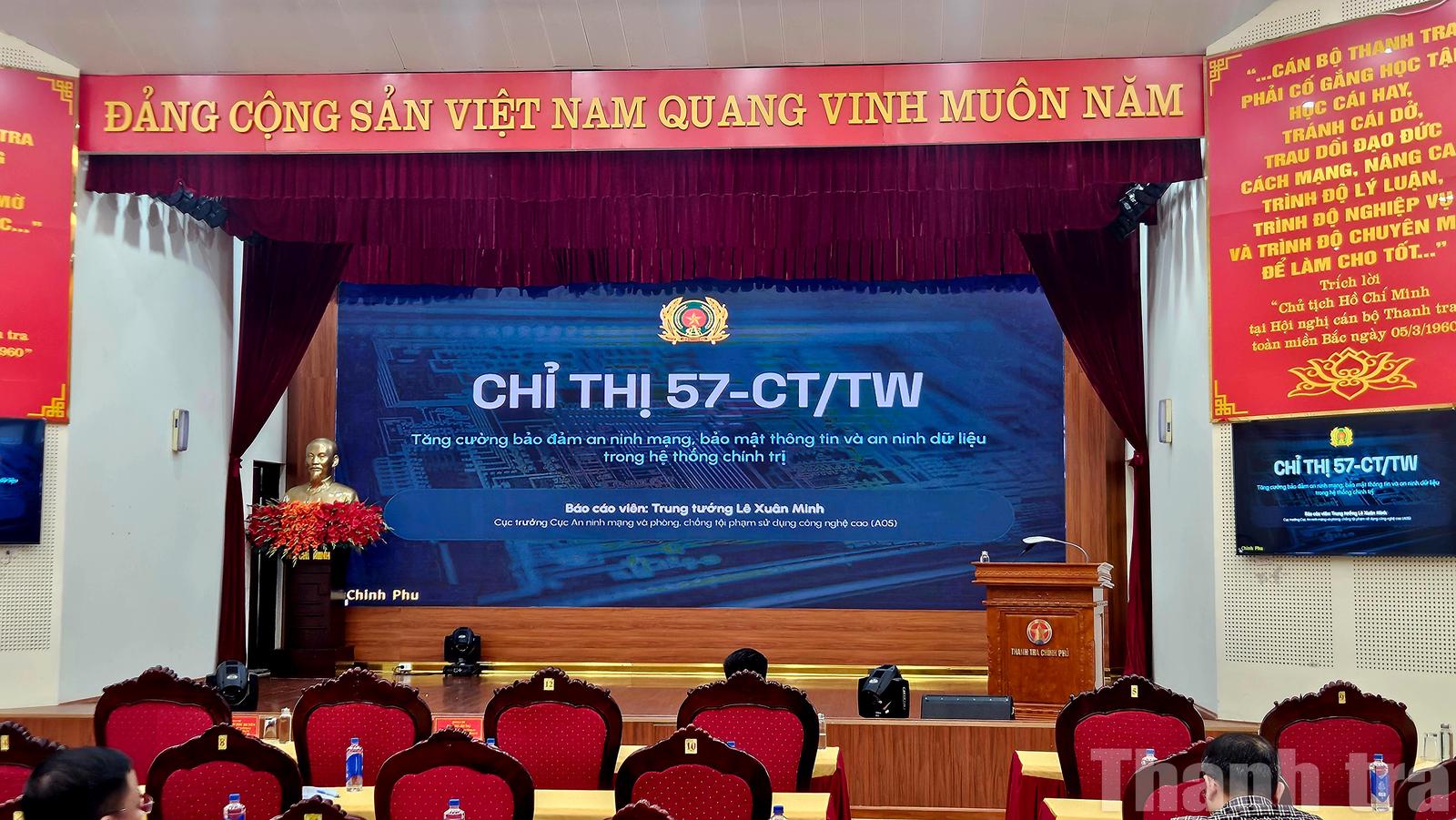 Cuối cùng, Trung tướng Lê Xuân Minh nhấn mạnh thêm là trong thời đại số, mỗi cán bộ, đảng viên không chỉ là người sử dụng công nghệ mà còn là một “chiến sĩ bảo vệ an ninh thông tin” ngay trong công việc hằng ngày của mình. Vì vậy, việc quán triệt và triển khai nghiêm túc Chỉ thị 57 là yêu cầu cấp thiết nhằm bảo vệ an ninh quốc gia, bảo vệ dữ liệu và bảo vệ sự phát triển bền vững của đất nước trong kỷ nguyên số.
