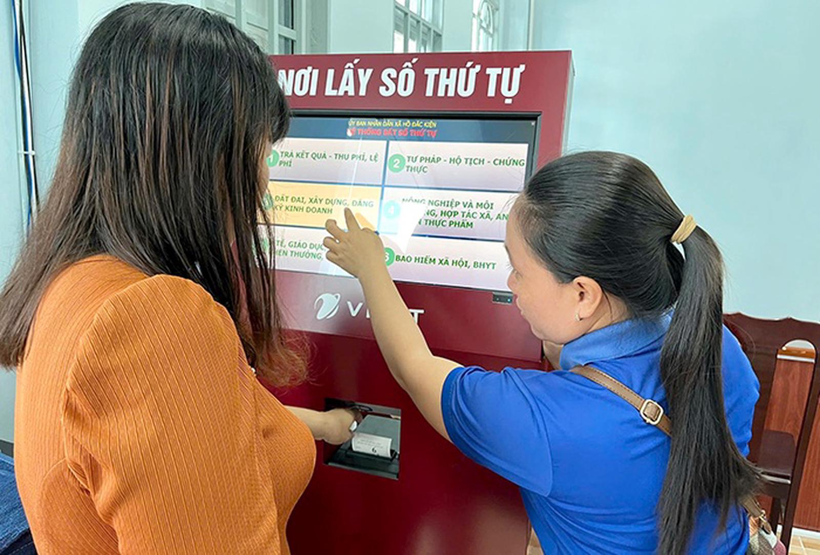 Đoàn viên xã Hồ Đắc Kiện hướng dẫn người dân đăng ký thực hiện thủ tục hành chính qua Kiosk thông minh. Ảnh: TT CĐS Cần Thơ