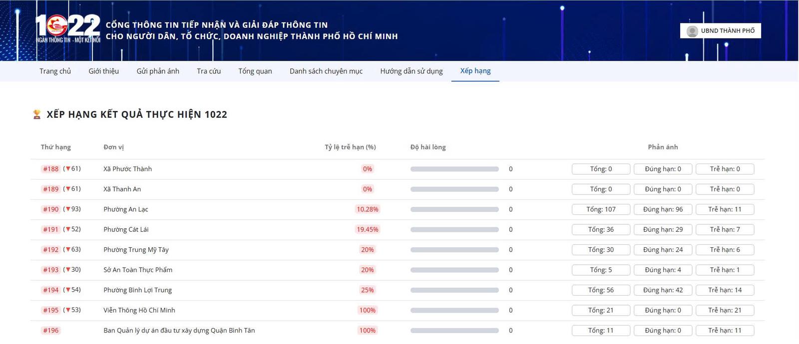 Một điểm sáng trong hoạt động của Cổng Thông tin 1022 là việc công bố công khai bảng xếp hạng các đơn vị theo tỷ lệ xử lý đúng hạn và chất lượng phản hồi. Việc này không chỉ tạo động lực cải tiến cho các đơn vị mà còn giúp người dân giám sát, đánh giá hiệu quả phục vụ của chính quyền.