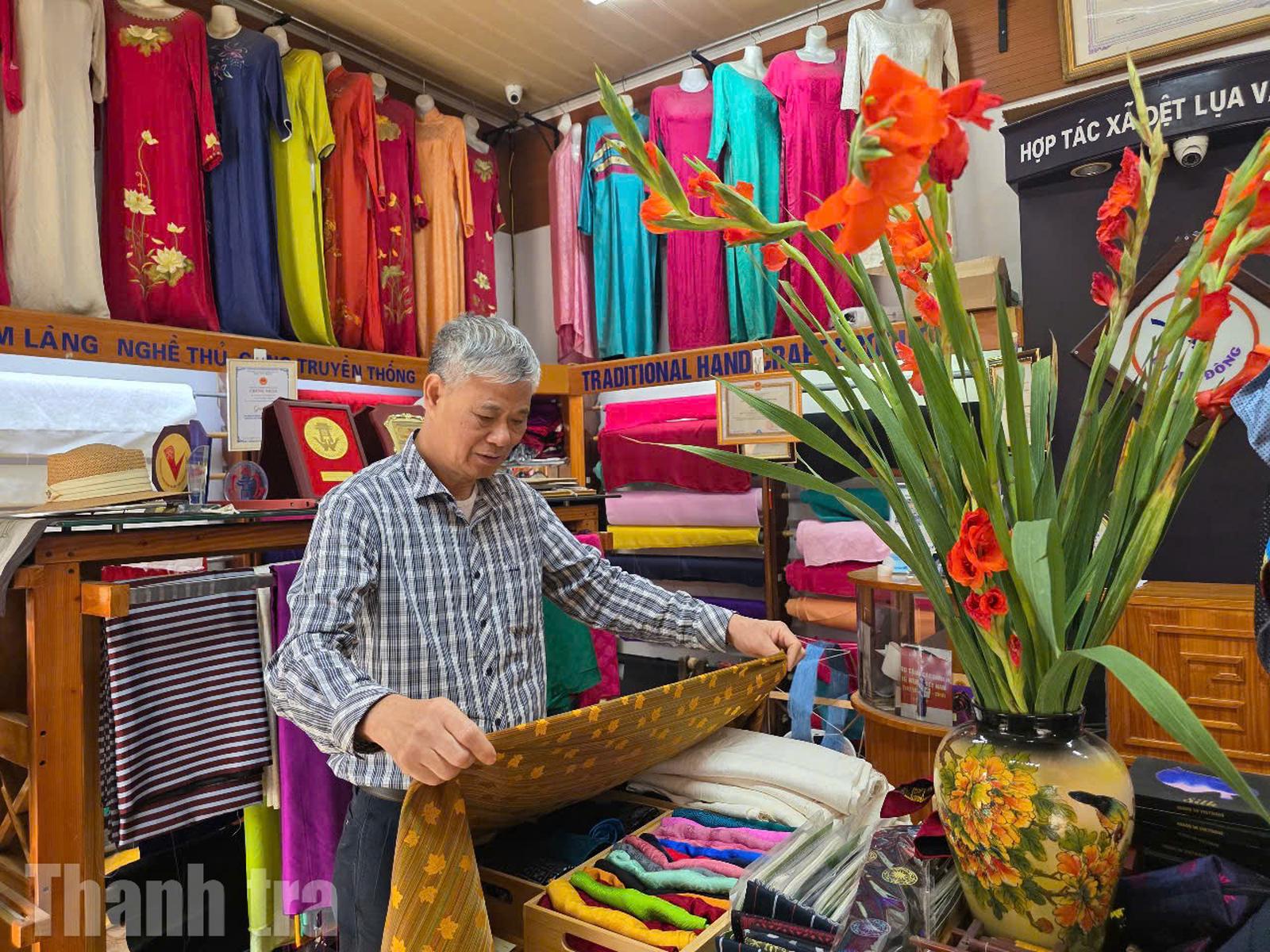 Anh Hiếu, chủ một cơ sở kinh doanh lụa có tiếng tại trung tâm làng Vạn Phúc. Ảnh: HH