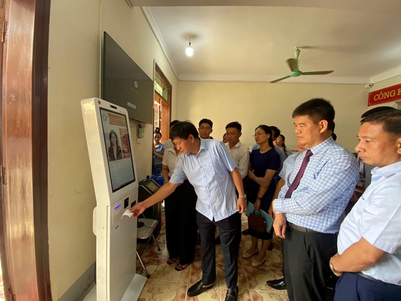 Chủ tịch UBND tỉnh Lê Thành Đô kiểm tra vận hành ki ốt dịch vụ công tại Trung tâm Phục vụ hành chính công xã Thanh Nưa. Ảnh: Nguyễn Dịu