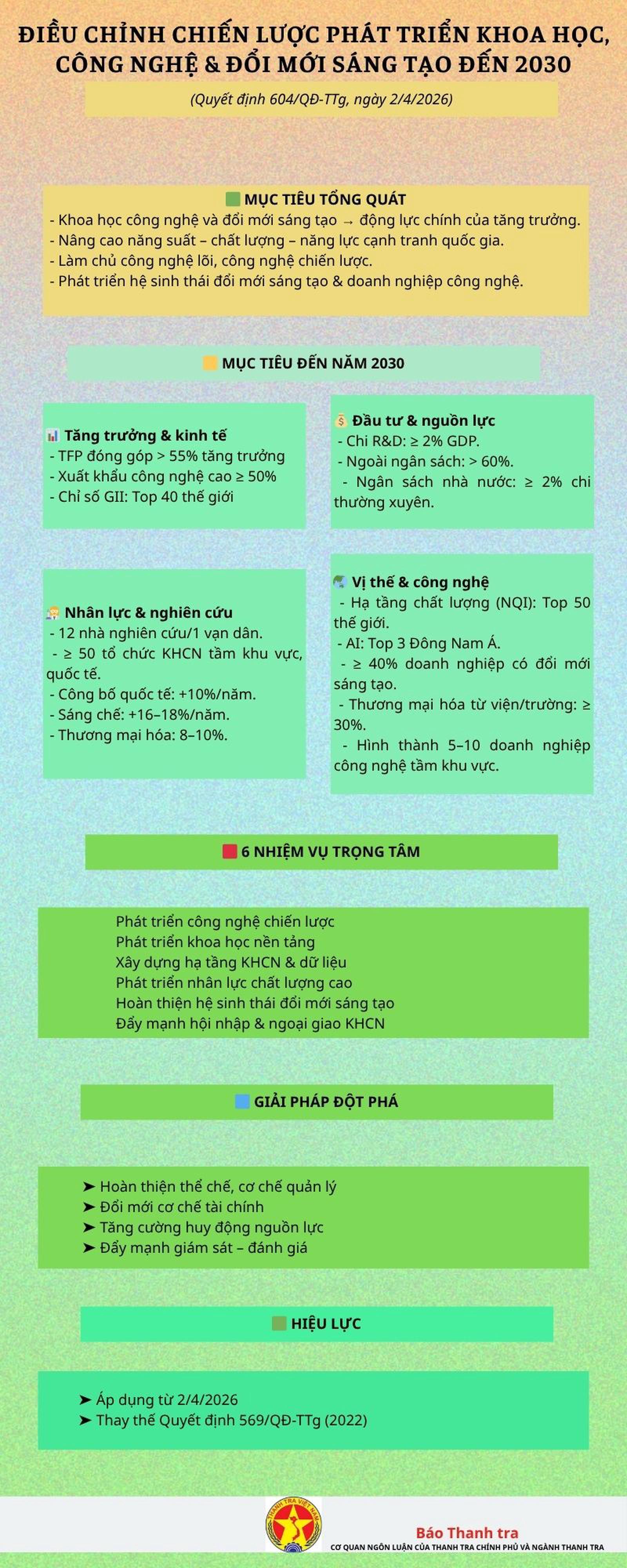 (Thanh tra) - Chiến lược mới xác định khoa học, công nghệ và đổi mới sáng tạo là động lực chủ yếu thúc đẩy tăng trưởng kinh tế, nâng cao năng lực cạnh tranh quốc gia và phát triển hệ sinh thái doanh nghiệp công nghệ trong giai đoạn tới.