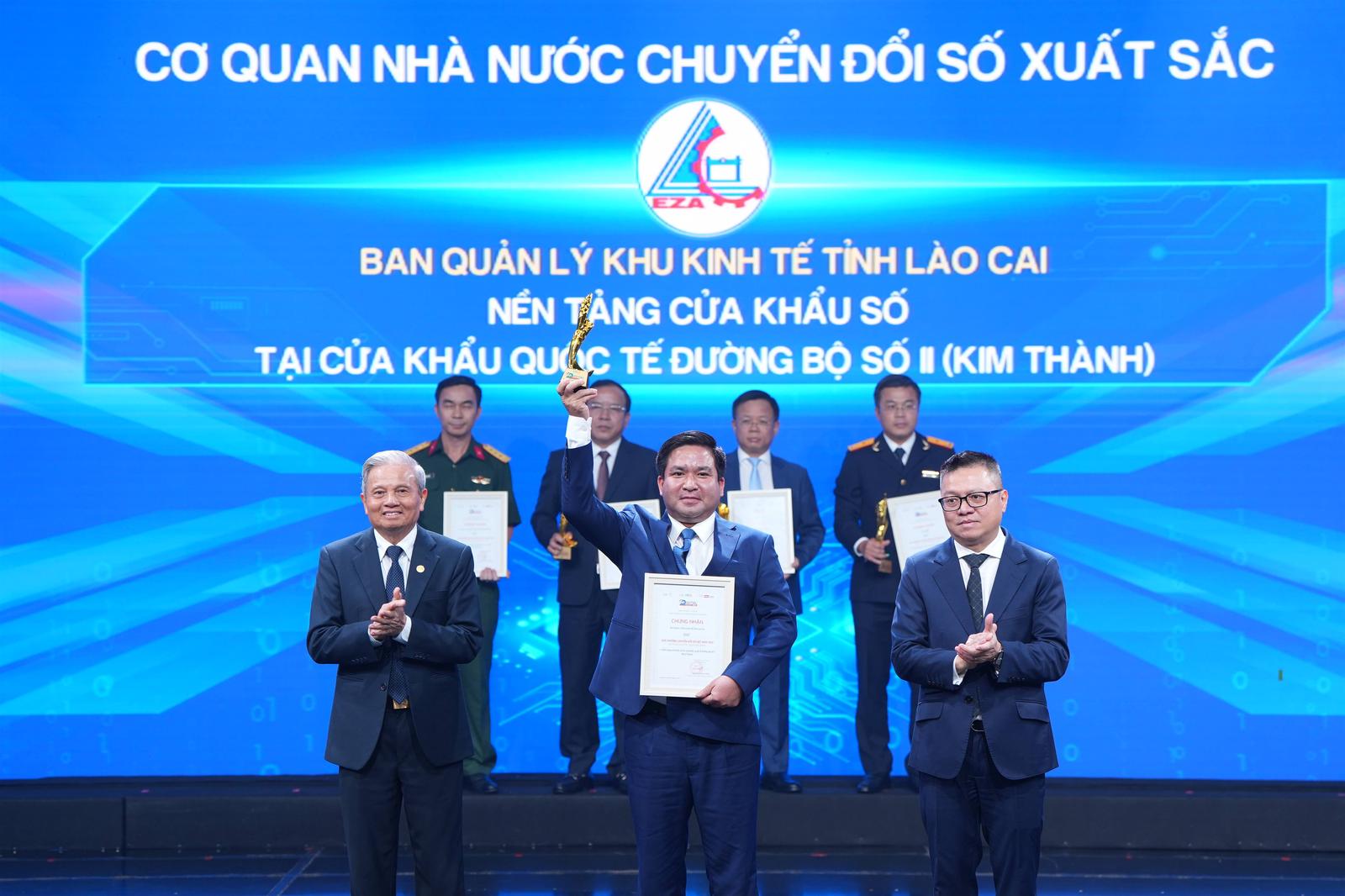 Đại diện Ban Quản lý Khu kinh tế tỉnh Lào Cai (giữa) nhận Giải thưởng Chuyển đổi số Việt Nam 2025. Ảnh: Bùi Minh Đức