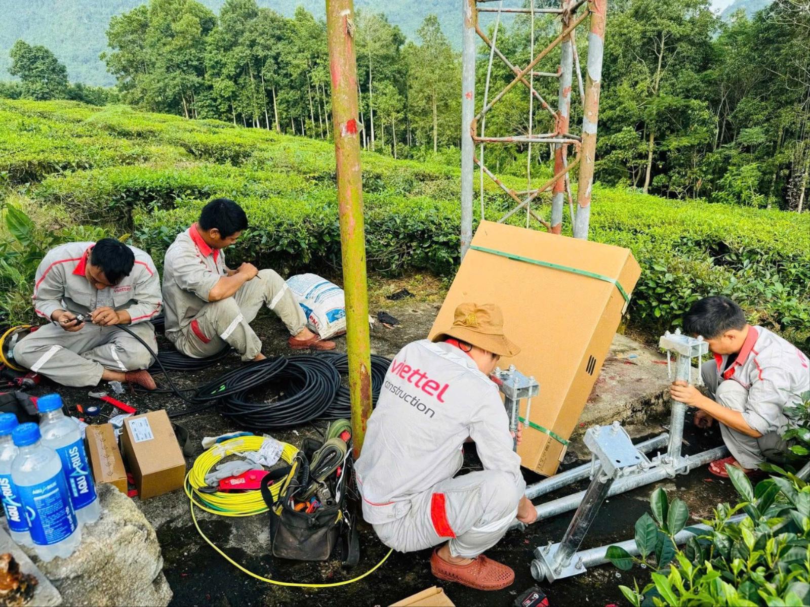 Cán bộ kỹ thuật viễn thông thi công, lắp đặt thiết bị hạ tầng mạng, góp phần mở rộng vùng phủ sóng và thúc đẩy chuyển đổi số ở nông thôn, vùng cao. Ảnh: Thanh Chi