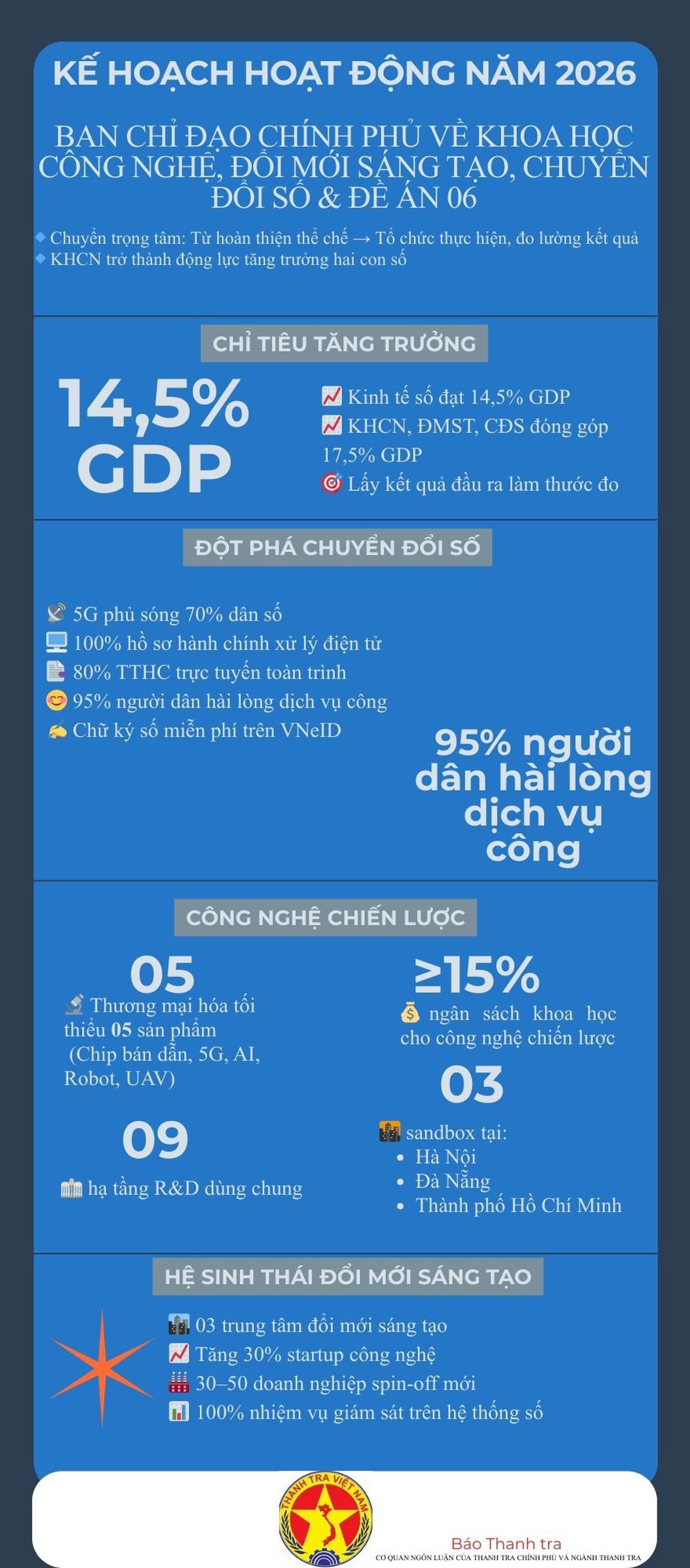 (Thanh tra) - Năm 2026, Chính phủ xác định chuyển trọng tâm từ hoàn thiện thể chế sang tổ chức thực hiện, đo lường và đánh giá kết quả phát triển khoa học, công nghệ, đổi mới sáng tạo và chuyển đổi số.