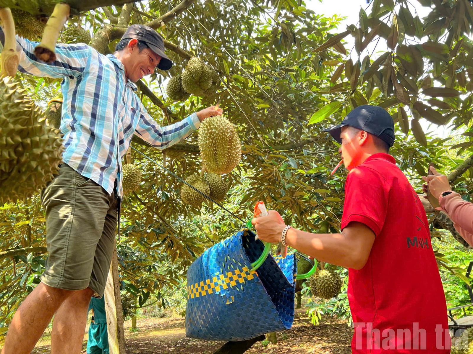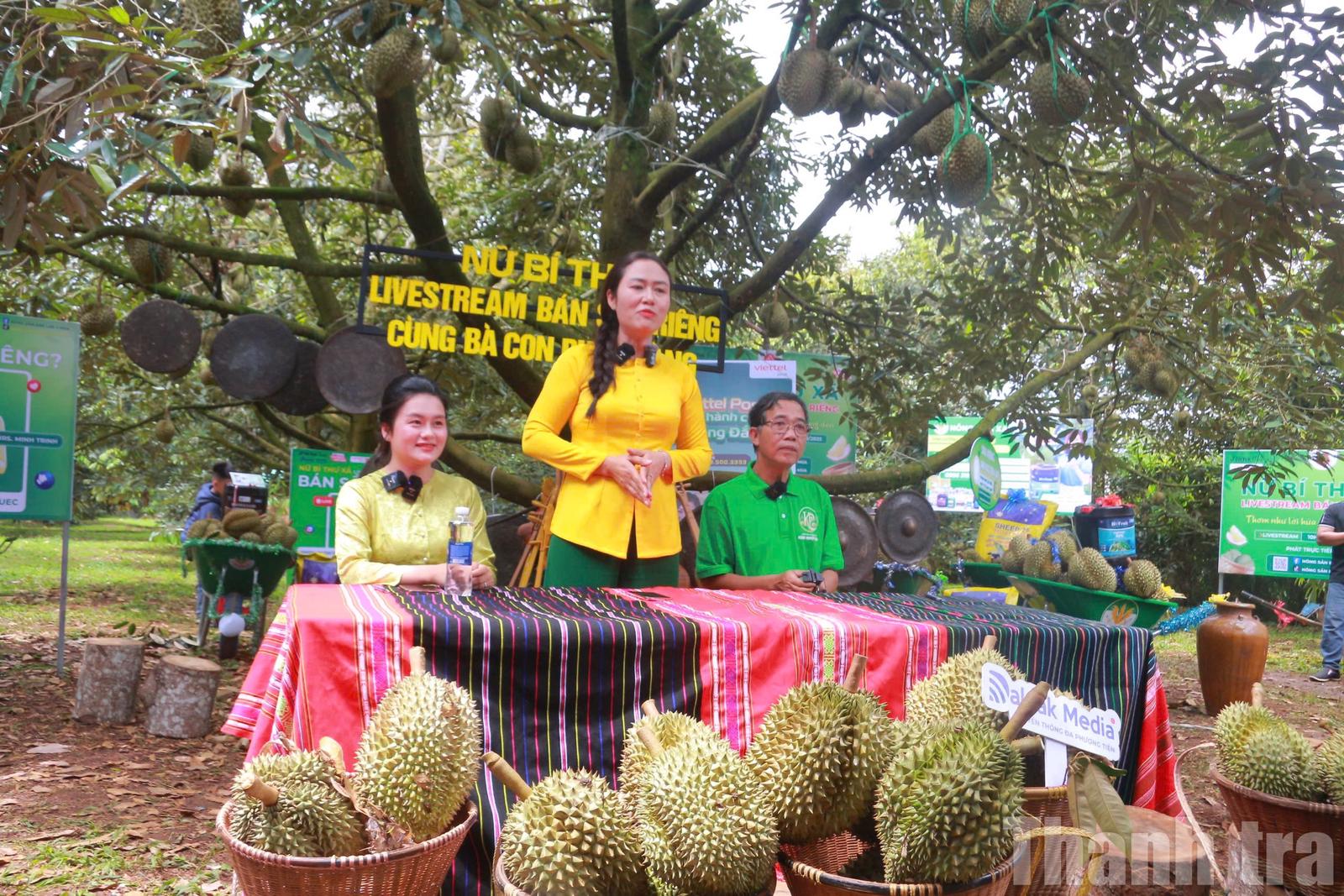 Bí thư Đảng ủy xã Ea Knuếc, bà Ngô Thị Minh Trinh (ở giữa), cùng bà con nông dân và các cộng tác viên đang livestream giới thiệu sầu riêng Ami Kâo – “Sầu riêng của mẹ” ngay tại vườn. Ảnh: NG