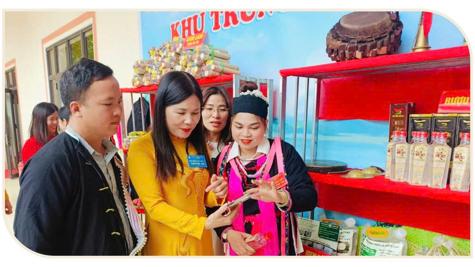Bà Nguyễn Thị Bích Nhiệm, Phó Chủ tịch Uỷ ban MTTQ tỉnh Lào Cai hướng dẫn người dân xã Cốc San mua hàng thanh toán bằng mã QR. Ảnh: Thu Hạnh