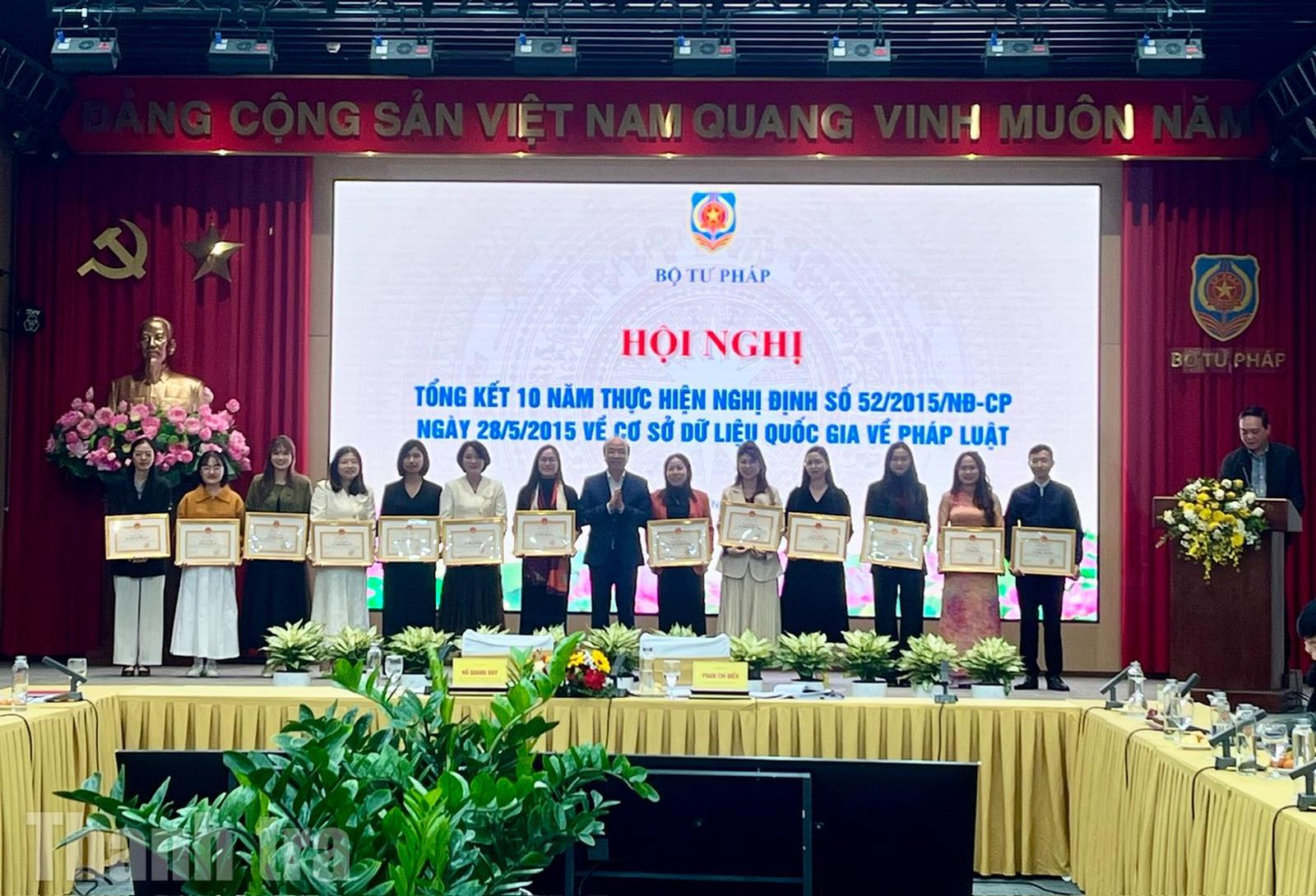 Tại hội nghị, Bộ Tư pháp đã tặng Bằng khen của Bộ trưởng Bộ Tư pháp cho các tập thể, cá nhân có thành tích xuất sắc trong triển khai thi hành Nghị định 52.