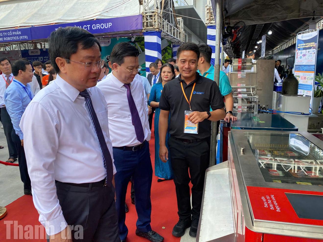 Lãnh đạo tỉnh Tây Ninh tham quan khu trưng bày, triển lãm sản phẩm khoa học - công nghệ, đổi mới sáng tạo. Ảnh: Thu Huyền