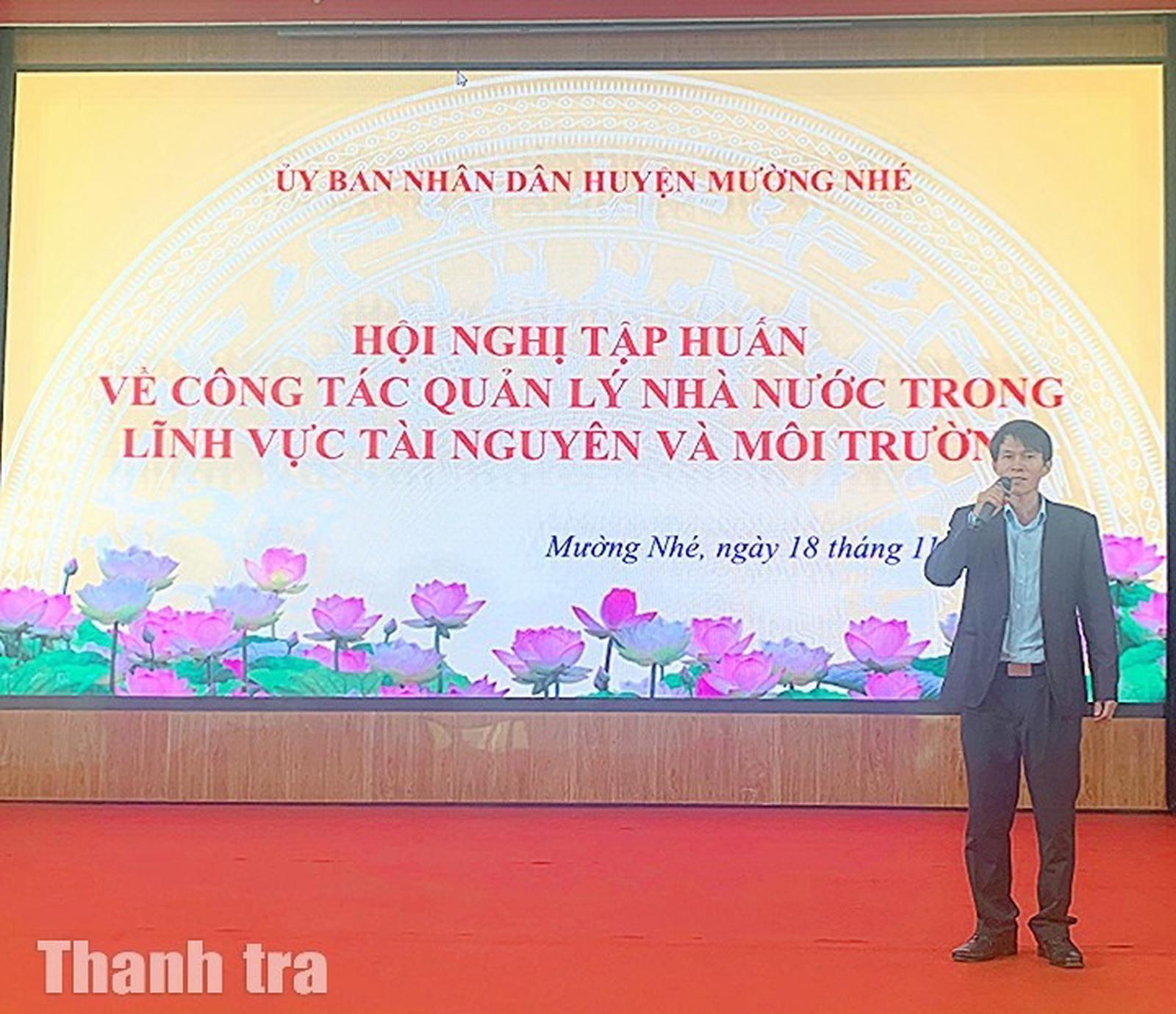 Đ/c Hoàng Hữu Côn - Phó Chánh thanh tra Sở Tài nguyên và Môi trường trao đổi, giải đáp các vướng mắc lĩnh vực tài nguyên và môi trường tại Hội nghị tập huấn ở huyện Mường Nhé