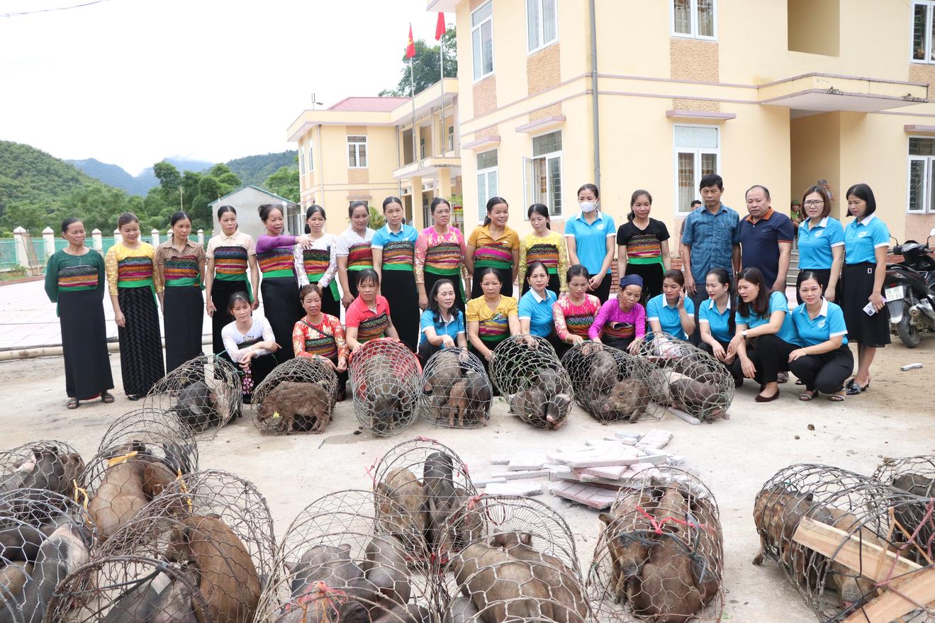 Tập huấn và trao con giống cho tổ hợp tác chăn nuôi lợn nái đen sinh sản do phụ nữ làm chủ ở xã Phú Lệ, huyện Quan Hóa. Ảnh: VT