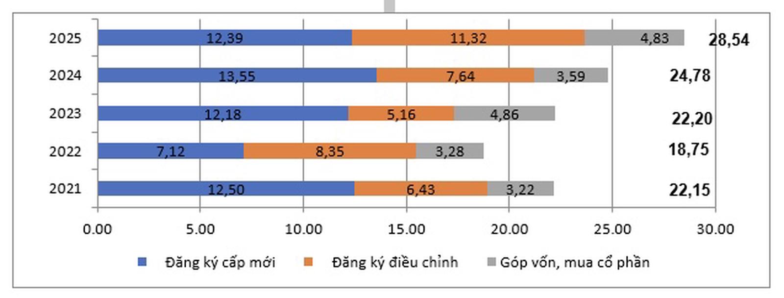 Vốn đăng ký cấp mới có 2.926 dự án được cấp phép với số vốn đăng ký đạt 12,39 tỷ USD, tăng 17,4% so với cùng kỳ năm trước về số dự án và giảm 8,6% về số vốn đăng ký.