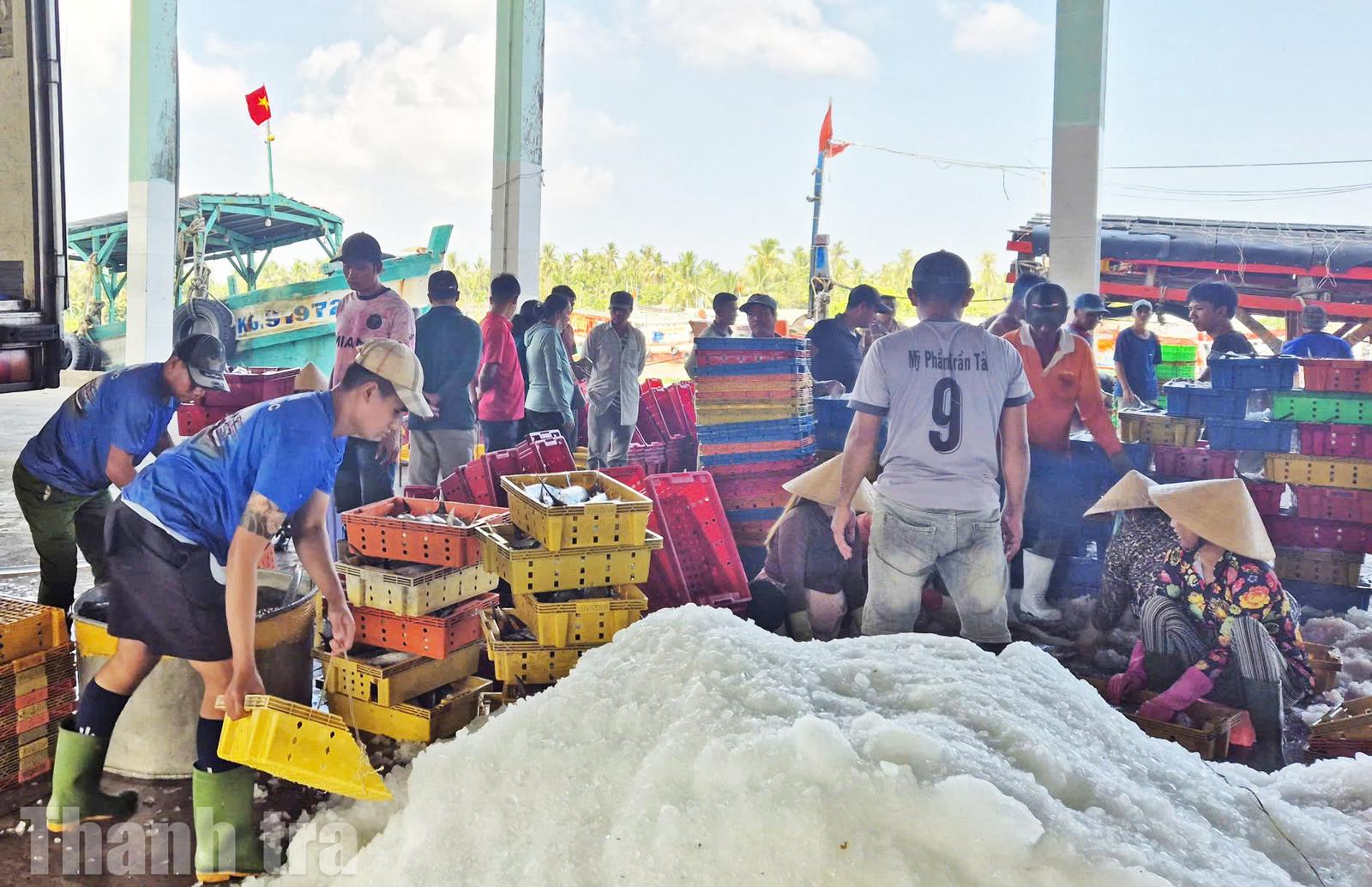 Hoạt động thu mua hải sản tại cảng cá Tắc Cậu, xã Bình An, tỉnh An Giang. Ảnh: Cảnh Nhật