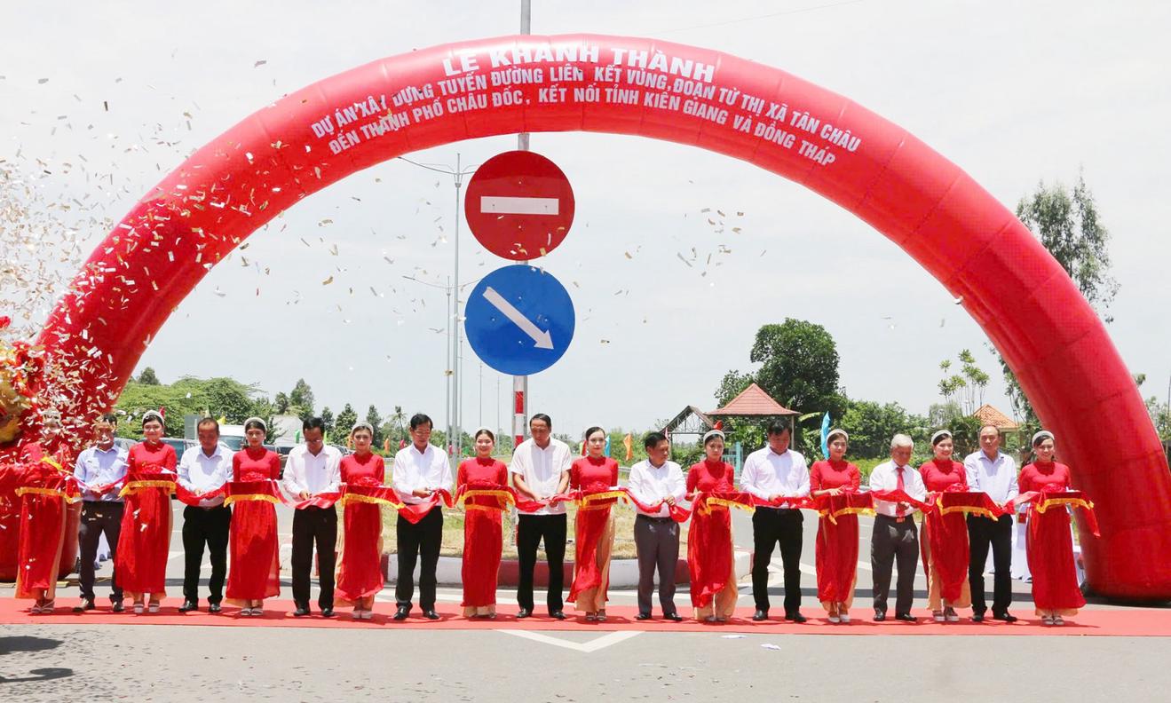 Khánh thành dự án xây dựng tuyến đường liên kết vùng đoạn từ Tân Châu đến Châu Đốc, kết nối với tỉnh Kiên Giang và Đồng Tháp. Ảnh: Cổng TTĐT An Giang