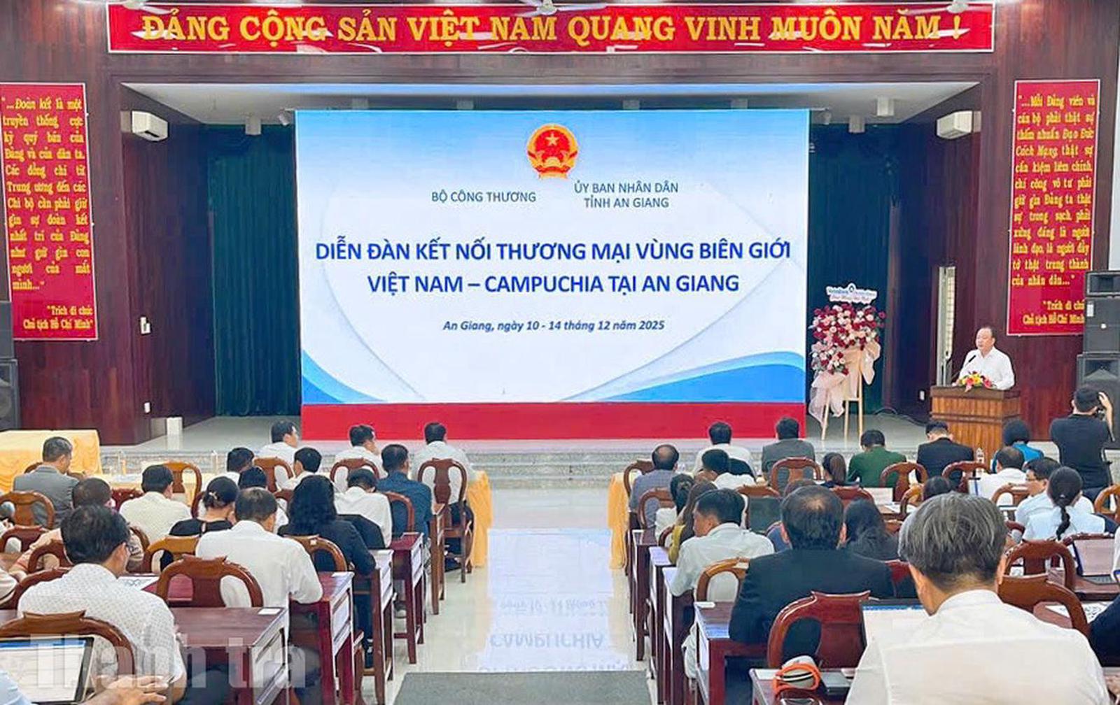 UBND tỉnh An Giang phối hợp với Bộ Công Thương tổ chức Diễn đàn Kết nối thương mại vùng biên giới Việt Nam - Campuchia. Ảnh: Cảnh Nhật
