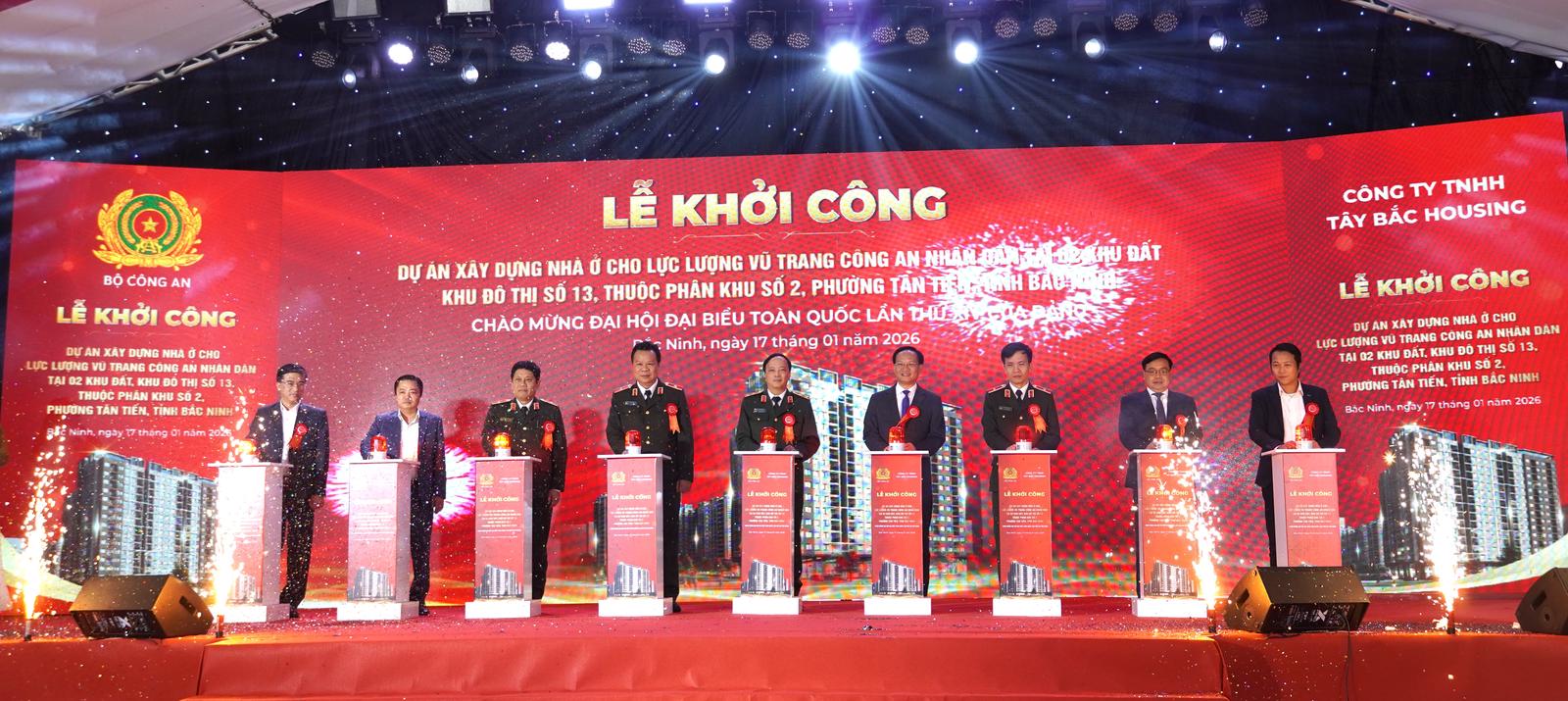 (Thanh tra) - Chào mừng Đại hội đại biểu toàn quốc lần thứ XIV của Đảng, sáng 17/1/2026, tại phường Tân Tiến, tỉnh Bắc Ninh, Bộ Công an phối hợp với UBND tỉnh Bắc Ninh và Công ty TNHH Tây Bắc Housing tổ chức Lễ khởi công Dự án Xây dựng nhà ở cho lực lượng vũ trang Công an nhân dân.