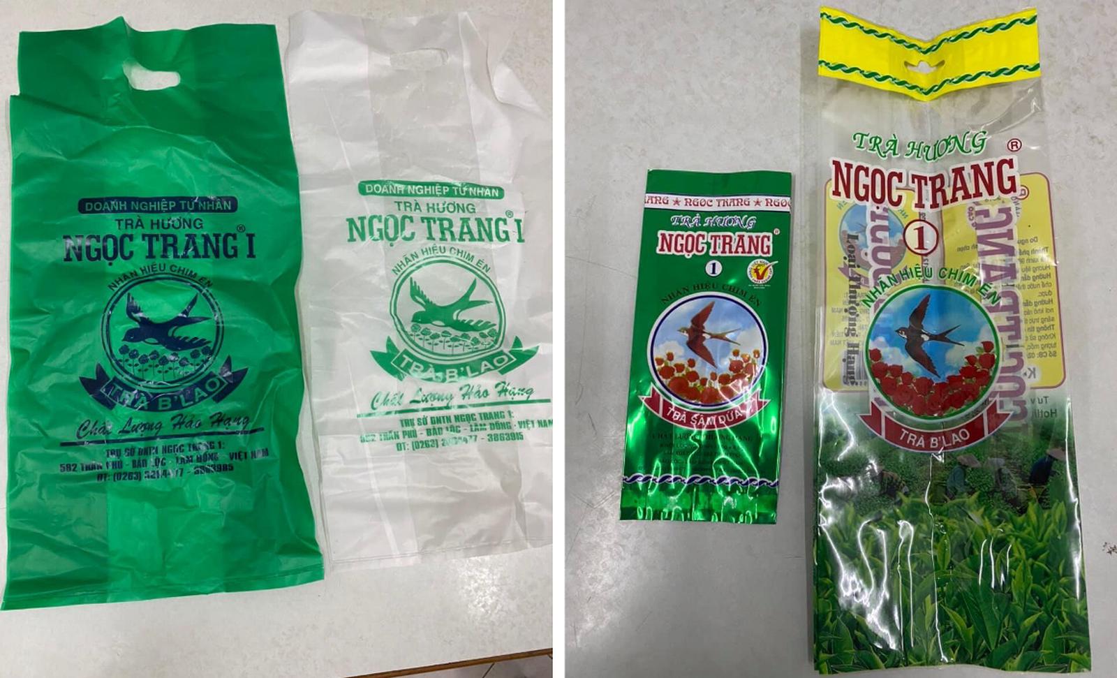 Tại kho chứa có nhiều loại bao bì mang các nhãn hiệu trà: Trà Long Phụng, trà Hiệp Thành, trà Hương Ngọc Trang 1, trà Thiên Hương 9, trà Thiên Hương, trà Bảo Trân, trà Bảo Tín 11. Bao bì cà phê các loại, 1,200kg nguyên liệu trà cùng dụng cụ là 2 máy ép bao bì, 2 cân các loại dùng để đóng gói sản phẩm.