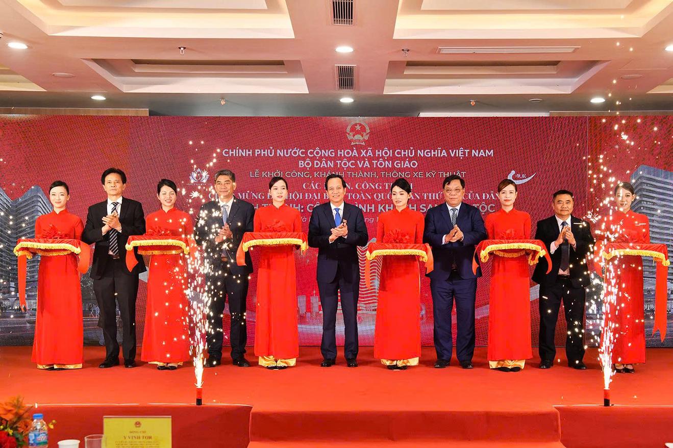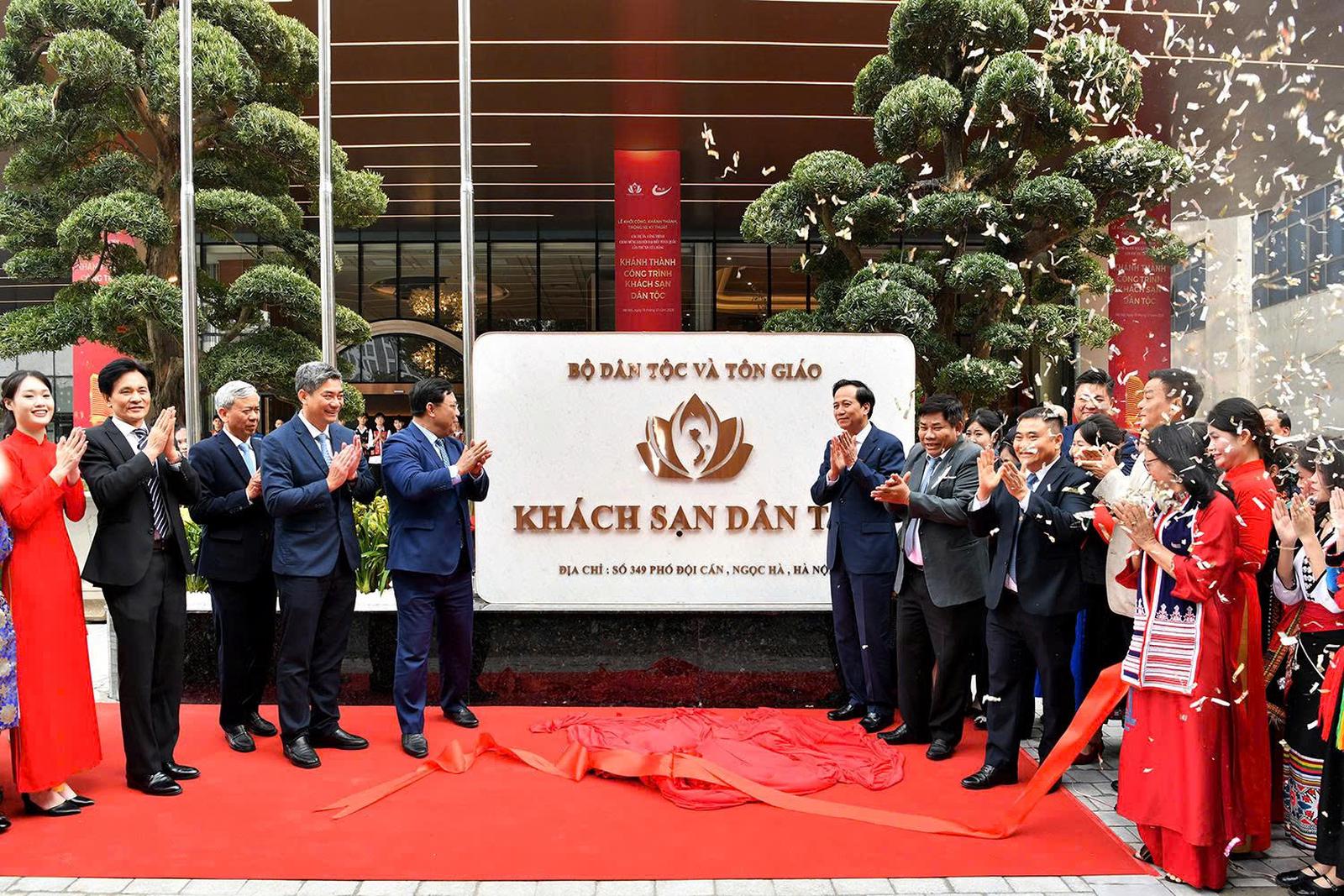 Bộ trưởng Bộ Dân tộc và Tôn giáo Đào Ngọc Dung cùng các đại biểu cắt băng khánh thành Khách sạn Dân tộc. Ảnh: Linh Thường