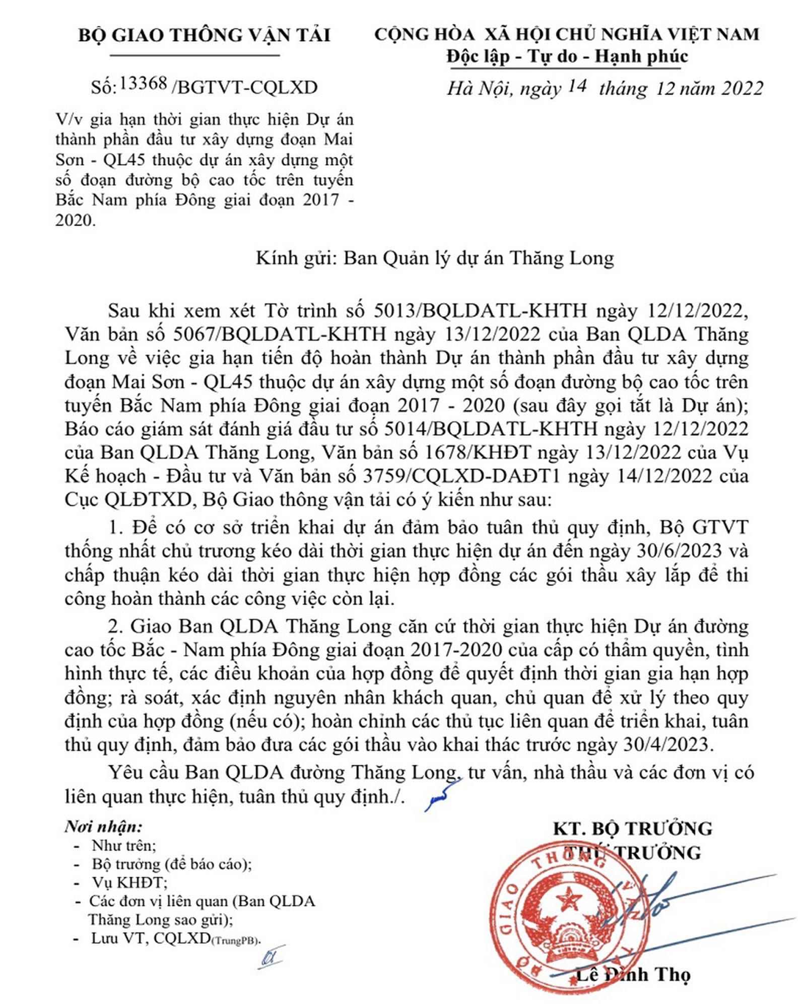 Bộ GTVT giao BQL DA Thăng Long căn cứ thời gian thực hiện DA đường cao tốc Bắc - Nam phía Đông giai đoạn 2017 - 2020 của cấp có thẩm quyền, tình hình thực tế, các điều khoản của hợp đồng để quyết định thời gian gia hạn hợp đồng; rà soát, xác định nguyên nhân khách quan, chủ quan để xử lý theo quy định của hợp đồng (nếu có); hoàn chỉnh các thủ tục liên quan để triển khai, tuân thủ quy định, đảm bảo đưa các gói thầu vào khai thác trước ngày 30/4/2023.