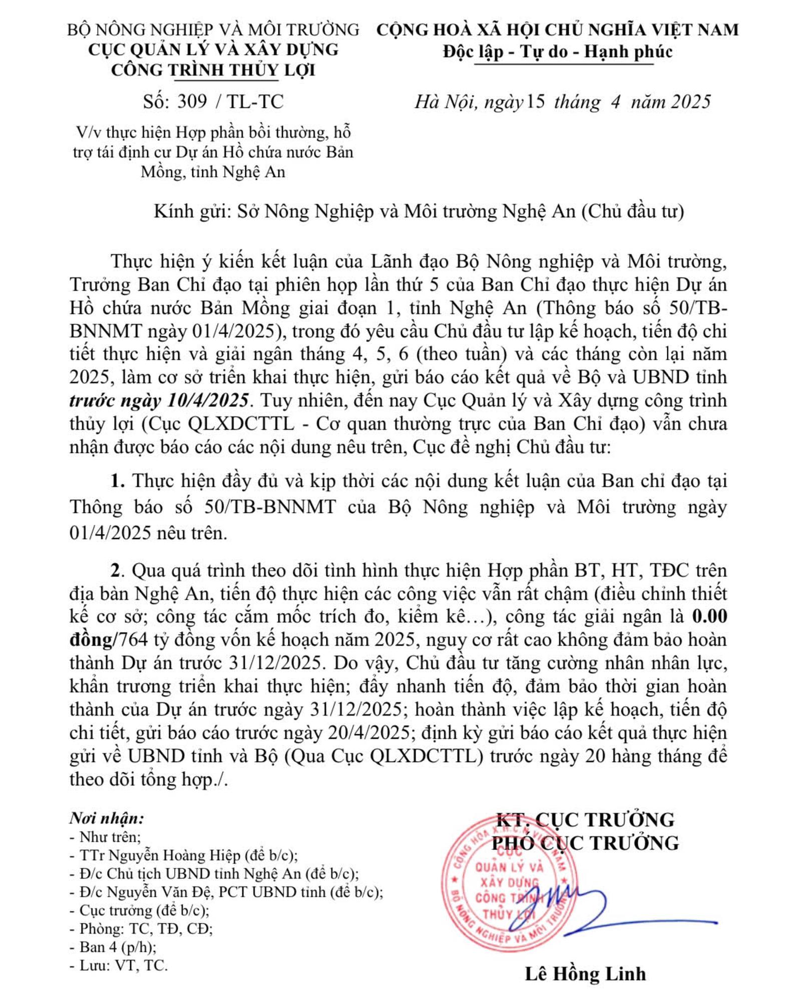 Ngày 15/4/2025, Cục Quản lý và Xây dựng công trình thủy lợi - Bộ Nông nghiệp và Môi trường đã có Văn bản số 309/TL-TC về việc thực hiện Hợp phần bồi thường, hỗ trợ tái định cư Dự án Hồ chứa nước Bản Mồng, tỉnh Nghệ An gửi Sở Nông Nghiệp và Môi trường Nghệ An.