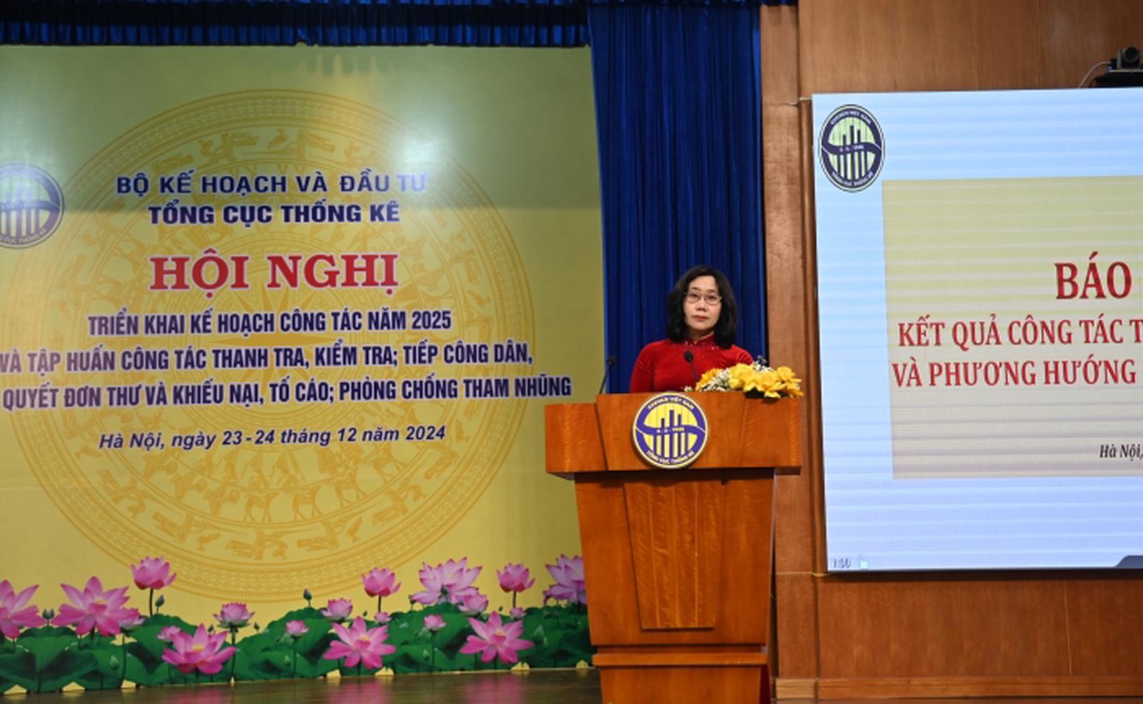 Bà cũng nhấn mạnh, với nhiệm vụ năm 2025 với chủ đề: “Kỷ cương, đoàn kết, tinh - gọn - mạnh, nâng cao năng lực, hiệu quả công tác thống kê”. Trong đó, nhiệm vụ trọng tâm là thực hiện sắp xếp, kiện toàn mô hình tổ chức của Tổng cục Thống kê; đảm bảo thông tin thống kê phục vụ lãnh đạo, chỉ đạo, điều hành của Đảng, Nhà nước và xây dựng văn kiện Đại hội Đảng các cấp tiến tới Đại hội đại biểu toàn quốc lần thứ XIV của Đảng; tiếp tục hoàn thiện môi trường pháp lý cho hoạt động thống kê; triển khai hiệu quả các nhiệm vụ của Chiến lược phát triển thống kê Việt Nam giai đoạn 2021-2030, tầm nhìn đến năm 2045.