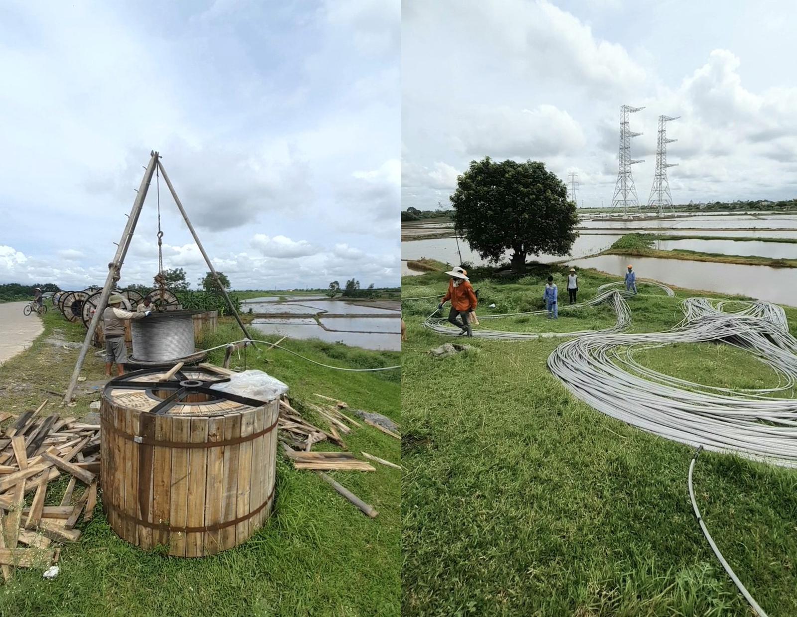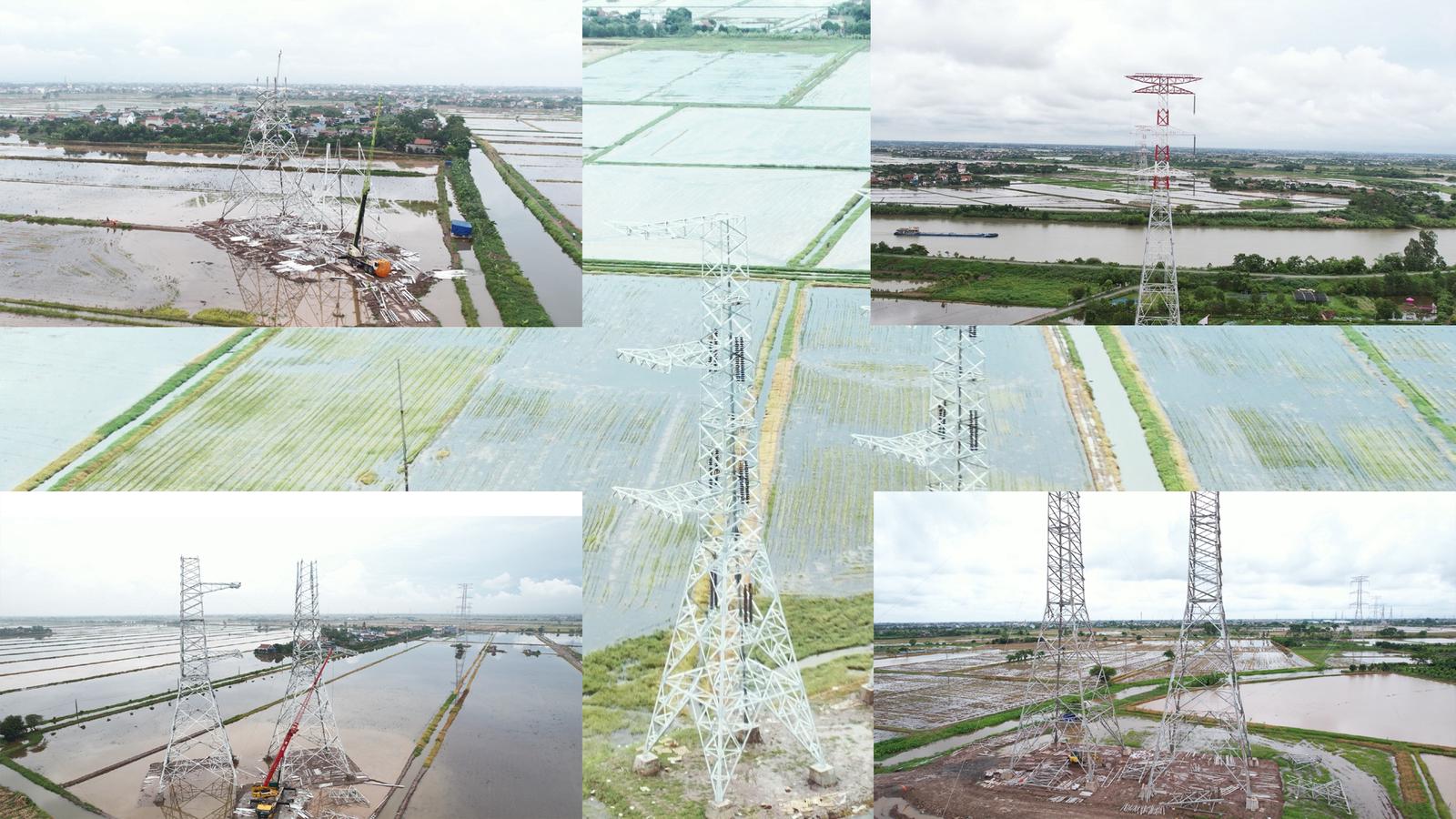 Trên địa bàn tỉnh Nam Định, nhiều vị trí cột đã hoàn thành việc lắp dựng, kéo dây, một số vị trí cột cũng đang gấp rút hoàn thành việc lắp, dựng cột. Ảnh: PV