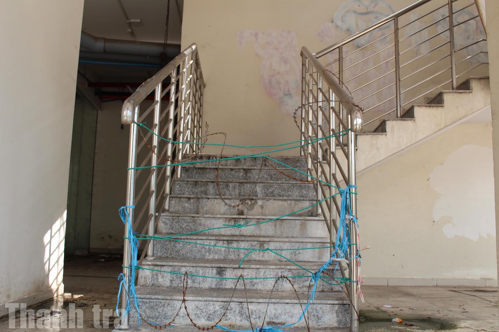 Tình trạng xuống cấp toà nhà khá nặng, thép gai giăng mắc sơ sài. Ảnh Minh Nghĩa