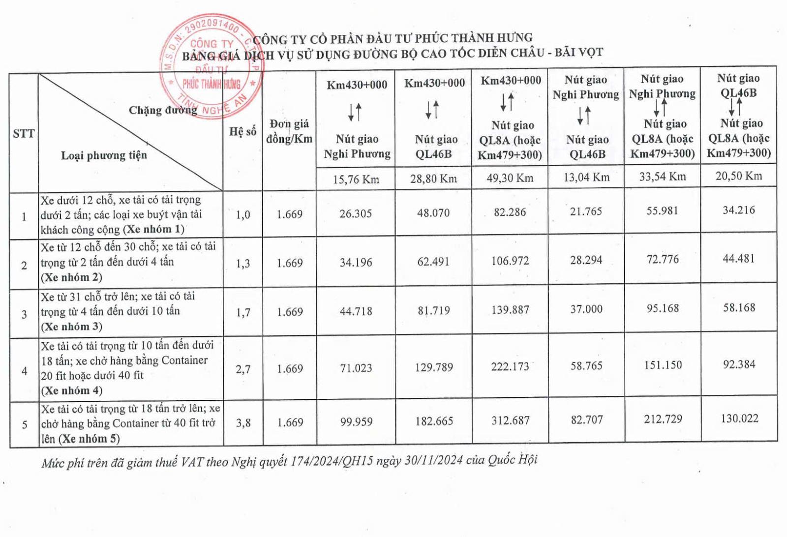 Căn cứ theo hợp đồng ký kết, mức thu phí cao tốc Diễn Châu - Bãi Vọt đối với xe dưới 12 ghế ngồi, xe tải có tải trọng dưới 2 tấn, các loại xe buýt vận tải khách công cộng (xe nhóm 1) thuộc hệ số 1, đơn giá 1.669 đồng/km.