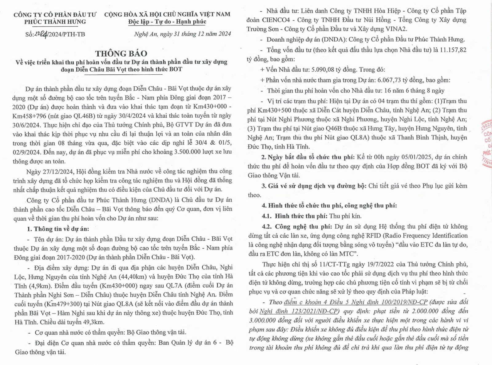 Ông Việt cho biết, để chuẩn bị cho việc thu phí, ngày 31/12/2024, Công ty Cổ phần Đầu tư Phúc Thành Hưng đã có Thông báo số 2284/2024/PTH-TB về việc triển khai thu phí hoàn vốn đầu tư dự án thành phần đầu tư xây dựng đoạn Diễn Châu - Bãi Vọt theo hình thức BOT gửi Bộ Giao thông vận tải (GTVT); UBND tỉnh Nghệ An, Hà Tĩnh; Cục Cảnh sát giao thông, Bộ Công an; Cục Đường bộ việt Nam; Cục Đường cao tốc Việt Nam và các đơn vị liên quan.