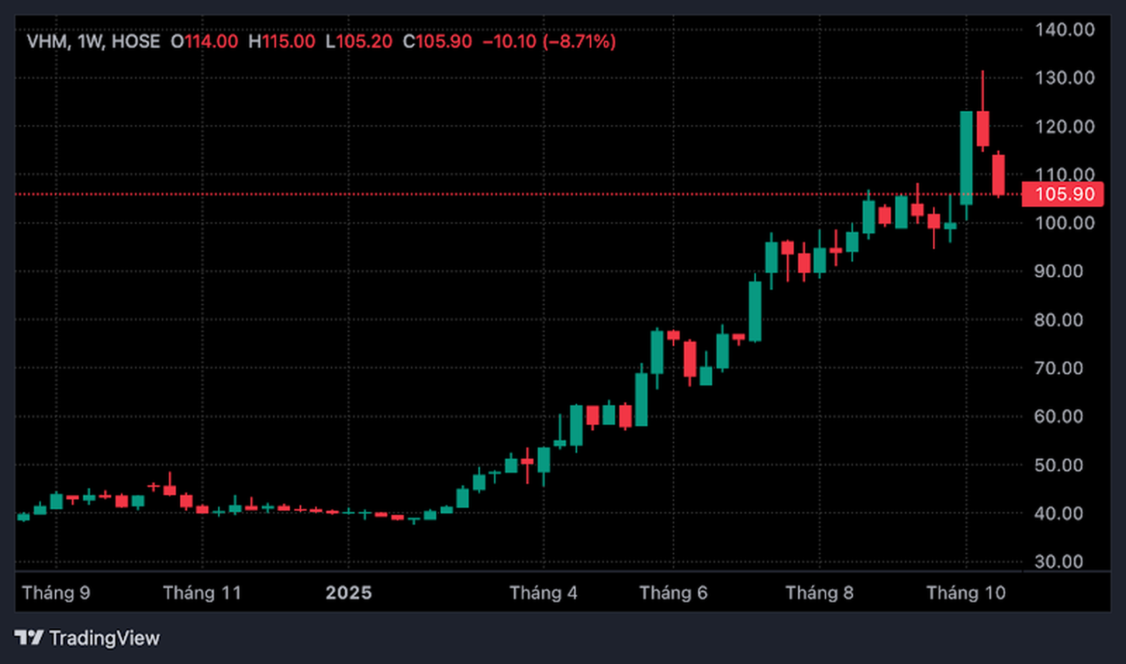 Là cổ phiếu vốn hóa lớn hàng đầu trong ngành, VHM đã ghi nhận mức tăng giá ấn tượng hơn 123% so với cùng kỳ năm ngoái, và gần 13% chỉ trong quý gần nhất. Từ đầu quý III/2025, cổ phiếu này tiếp tục duy trì đà tăng ổn định, bất chấp thị trường chung có nhiều biến động.
