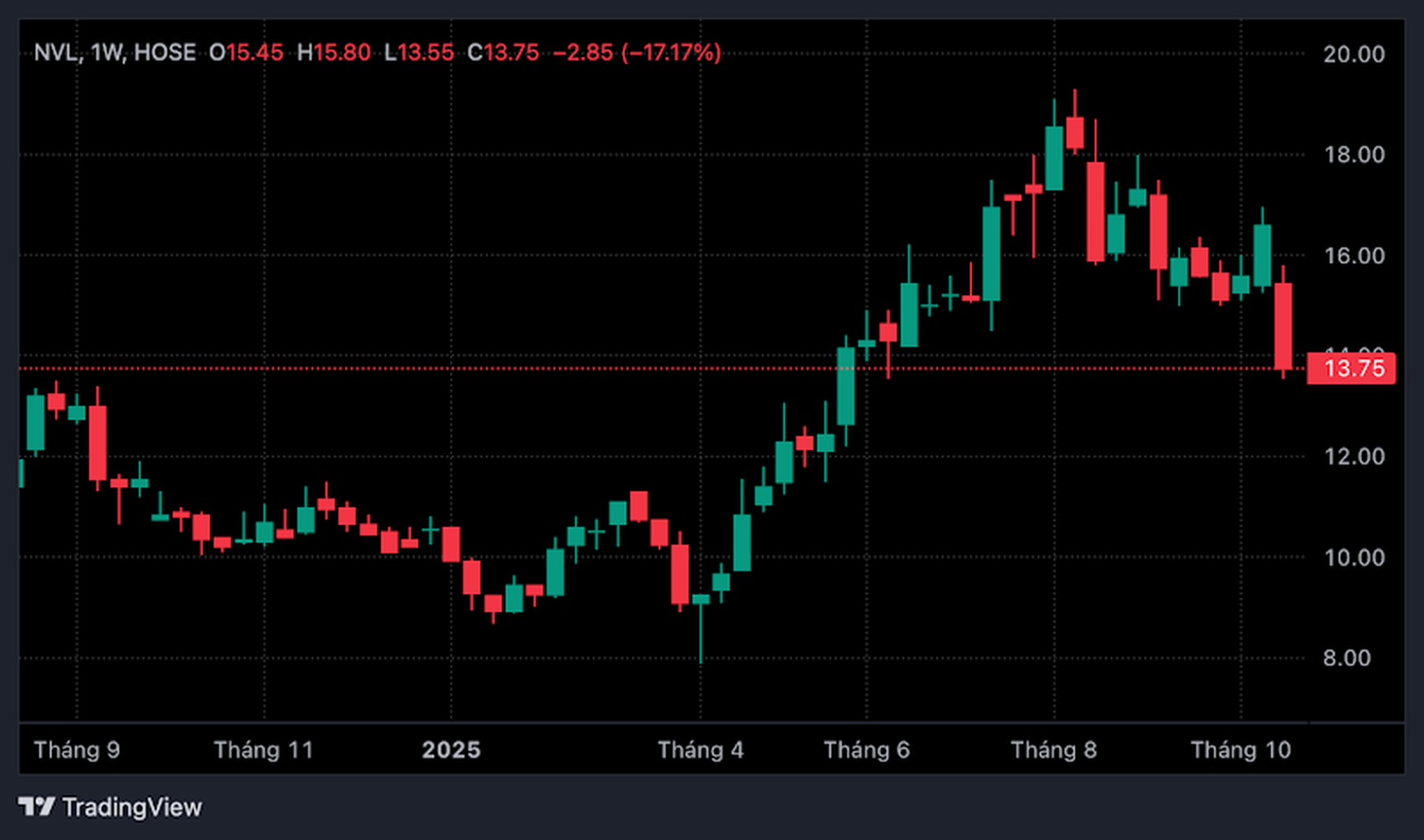Trái ngược với các cổ phiếu trên, NVL đang trong giai đoạn điều chỉnh sâu. Giá cổ phiếu giảm gần 19% trong quý III/2025 và mất thêm hơn 11% trong tháng 10/2025. Tuy nhiên, so với đáy thiết lập hồi đầu năm, cổ phiếu này vẫn tăng khoảng 36%.