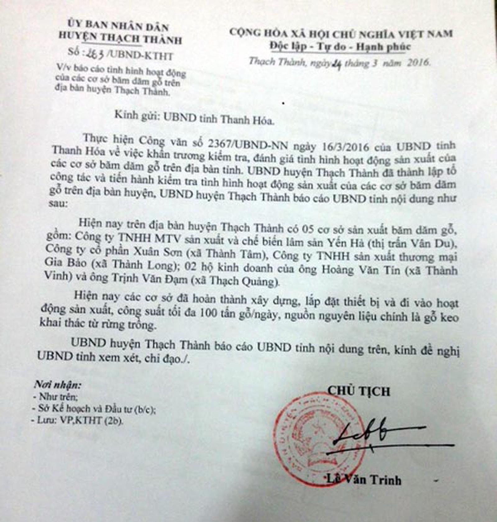 Theo Báo cáo 263 ngày 24/3/2016 của UBND huyện Thạch Thành, trên địa bàn hiện có 5 đơn vị sản xuất băm dăm gỗ gồm: Công ty TNHH MTV Sản xuất và Chế biến lâm sản Yến Hà (thị trấn Vân Du); Công ty Cổ phần Vân Sơn (xã Thành Tâm); Công ty TNHH Sản xuất thương mại Gia Bảo (xã Thành Long); 2 hộ kinh doanh của ông Hoàng Văn Tín (xã Thành Vinh) và ông Trịnh Văn Đạm (xã Thạch Quảng). Hiện các cơ sở đã đi vào hoạt động với công suất tối đa 100 tấn gỗ/ngày, nguồn nguyên liệu chính là gỗ keo khai thác từ rừng trồng.