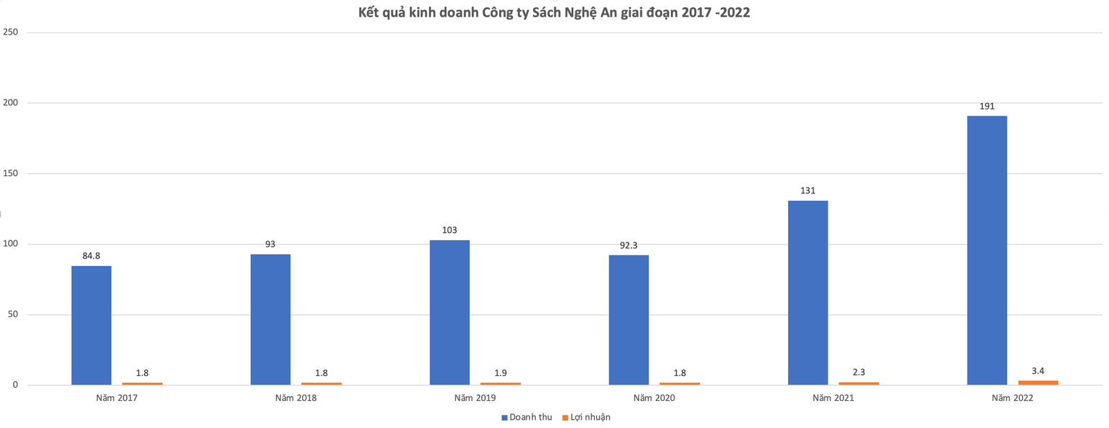 Doanh thu tại Sách Nghệ An có xu hướng tăng đều đặn khi trước đó, chỉ tiêu này lần lượt là 84,8 tỷ đồng (năm 2017), 93 tỷ đồng (năm 2018), 103 tỷ đồng (năm 2019), 92,3 tỷ đồng (năm 2020), 131 tỷ đồng (năm 2021).