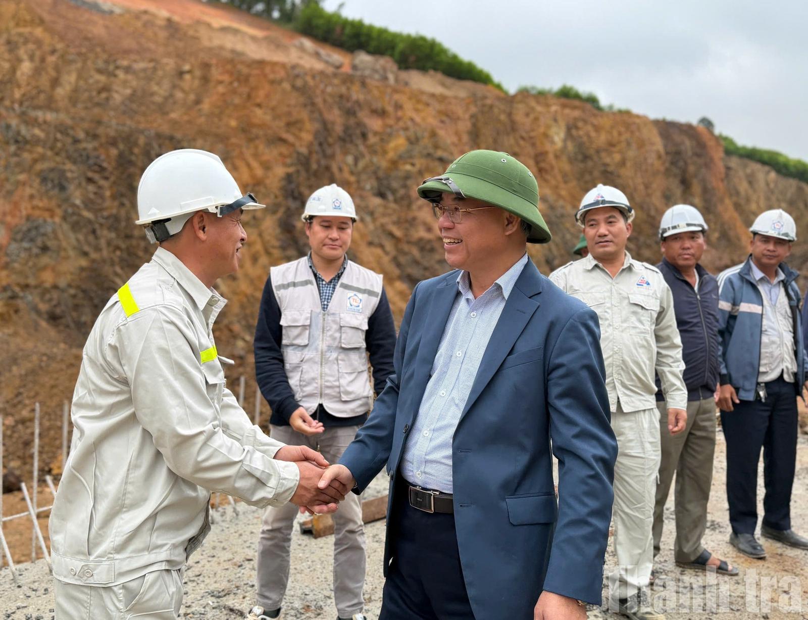 Phó Chủ tịch UBND tỉnh Đắk Lắk Trương Công Thái thăm hỏi, động viên các kỹ sự, công nhân đang trực tiếp thi công Dự án thành phần 2 cao tốc Khánh Hòa – Buôn Ma Thuột. Ảnh: NG