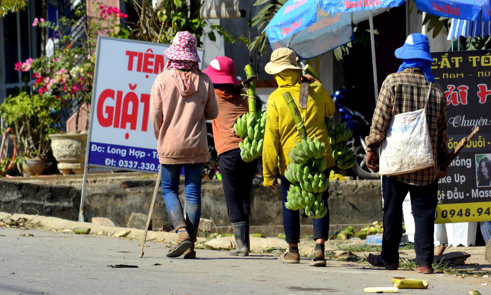 Những chị, những mẹ đi bộ hàng cây số mang chuối từ vườn nhà ra chợ. Ảnh: Minh Tân