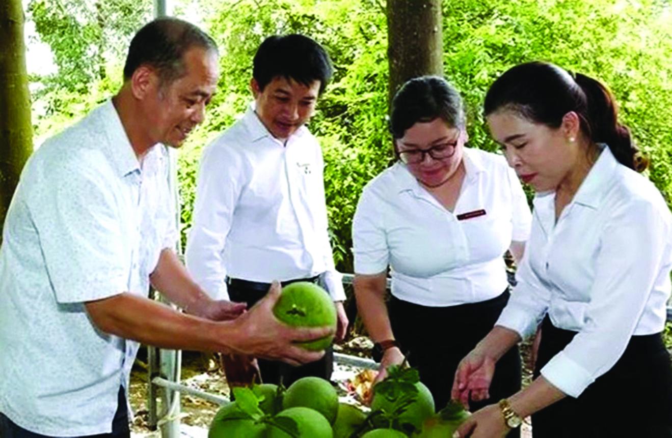 Ông Tống Văn Hướng giới thiệu bưởi da xanh đang hoàn tất thủ tục chứng nhận sản phẩm OCOP với các cán bộ Agribank