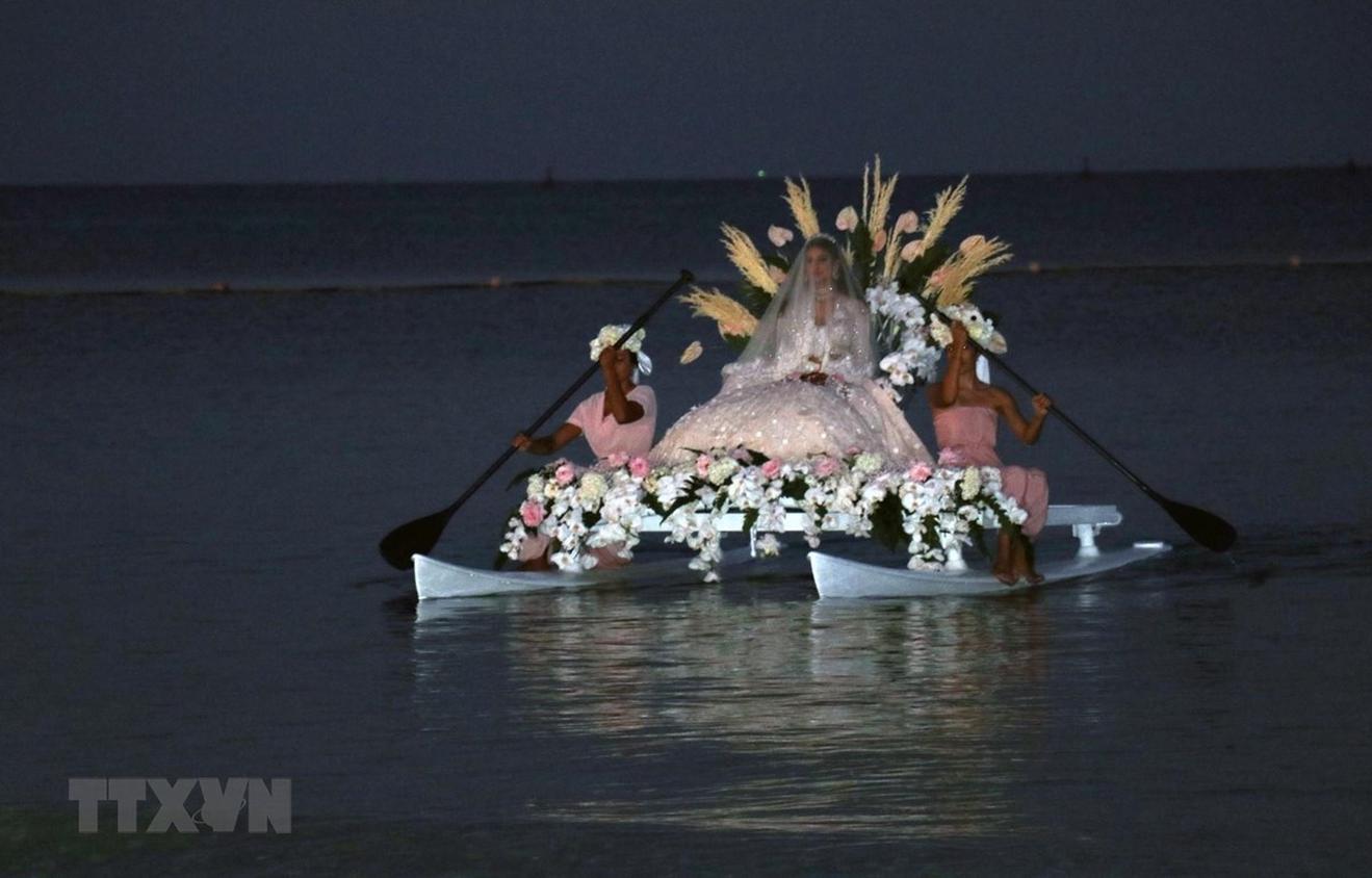 Cô dâu trên thuyền từ ngoài biển khơi tiến vào bờ trong nghi lễ đám cưới. (Ảnh: Lê Huy Hải/TTXVN)
